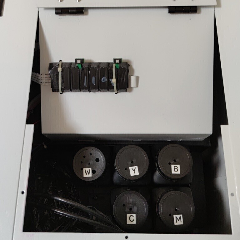 安価なUVプリンタはインクボトルが外付けですがこのプリンタはインクボトルを内部に置けます。
