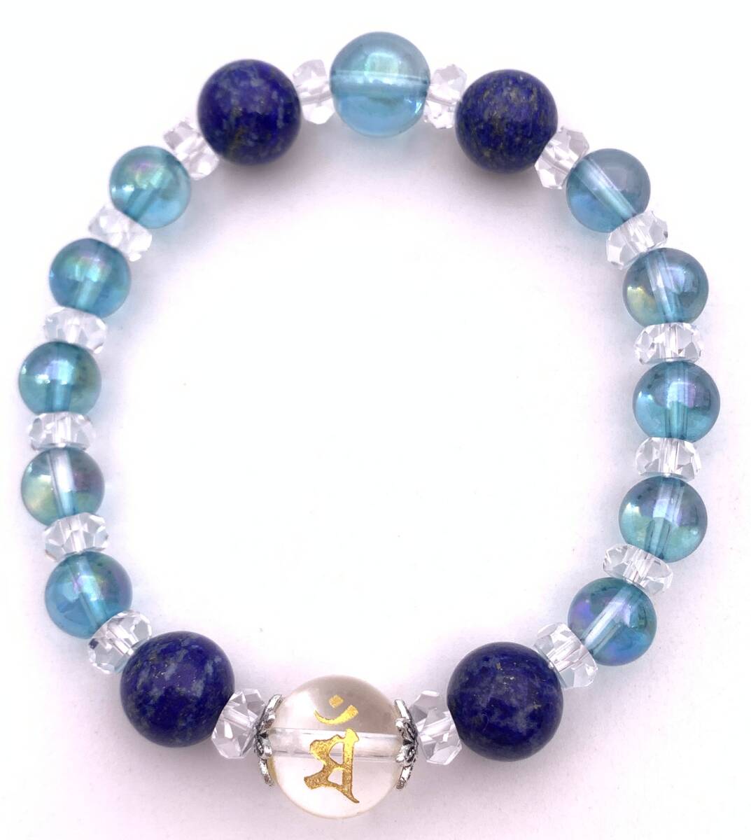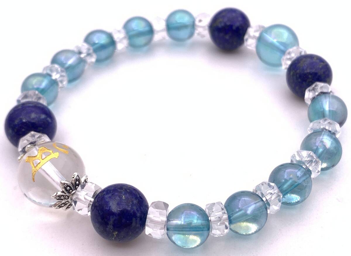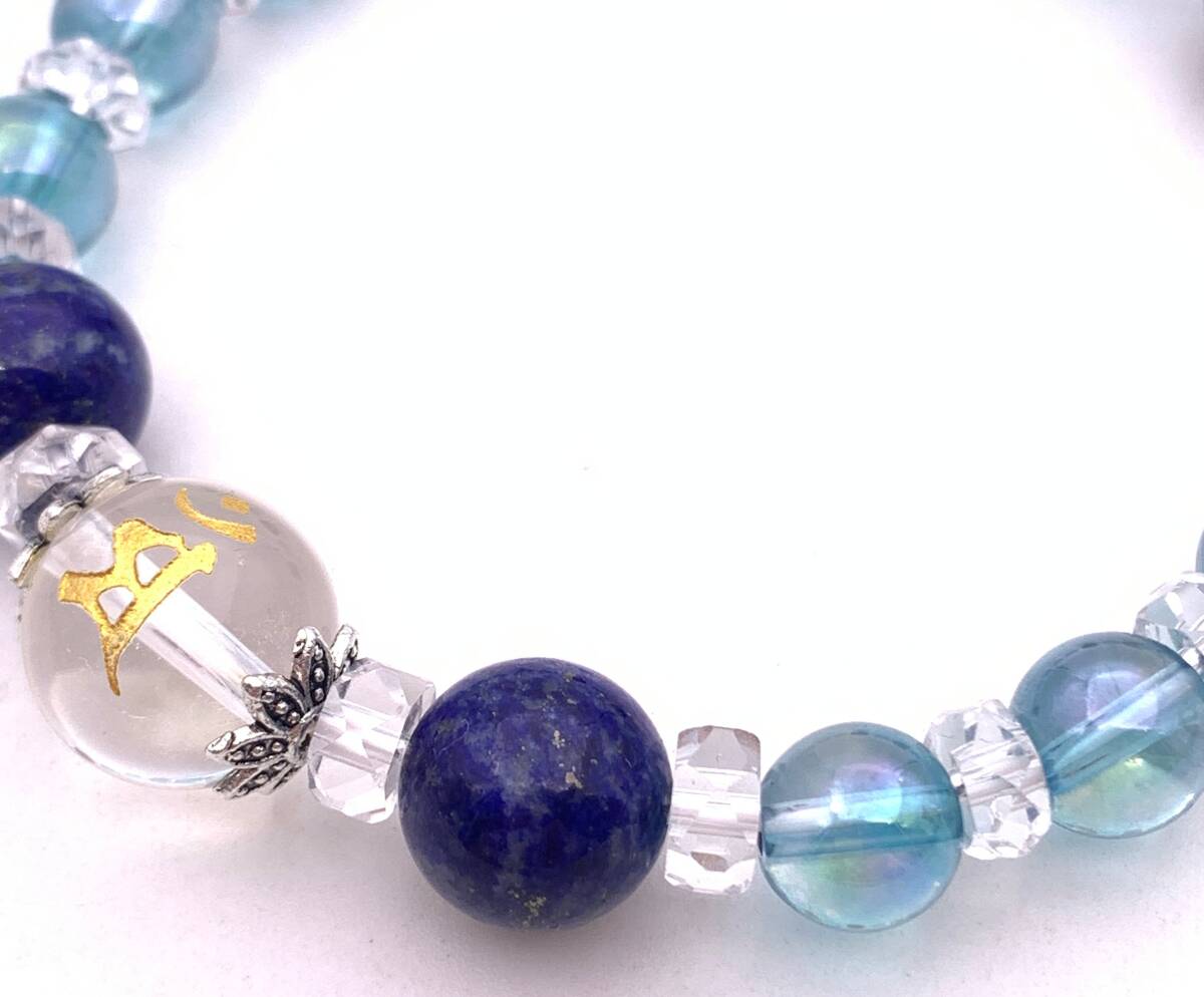 天然石水晶守護仏梵字金彫り12mm玉&アクアオーラブルー&ラピスラズリのブレスレット
