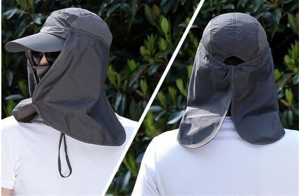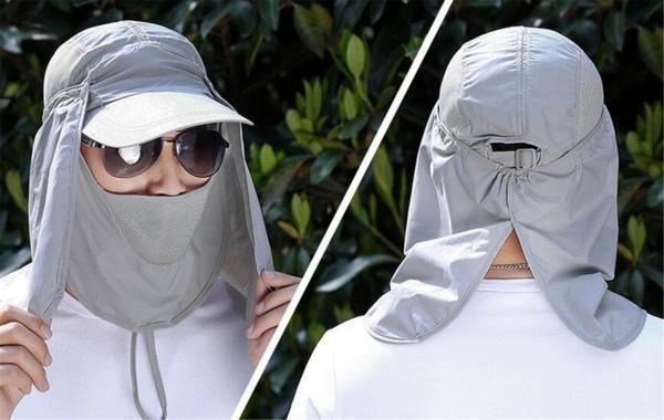 頭・目・顔・首・耳を紫外線から守ります。帽子(頭・目)、タレ装着(耳・後首)、タレ・マスク装着(顔・前首)と3wayで使用可能。