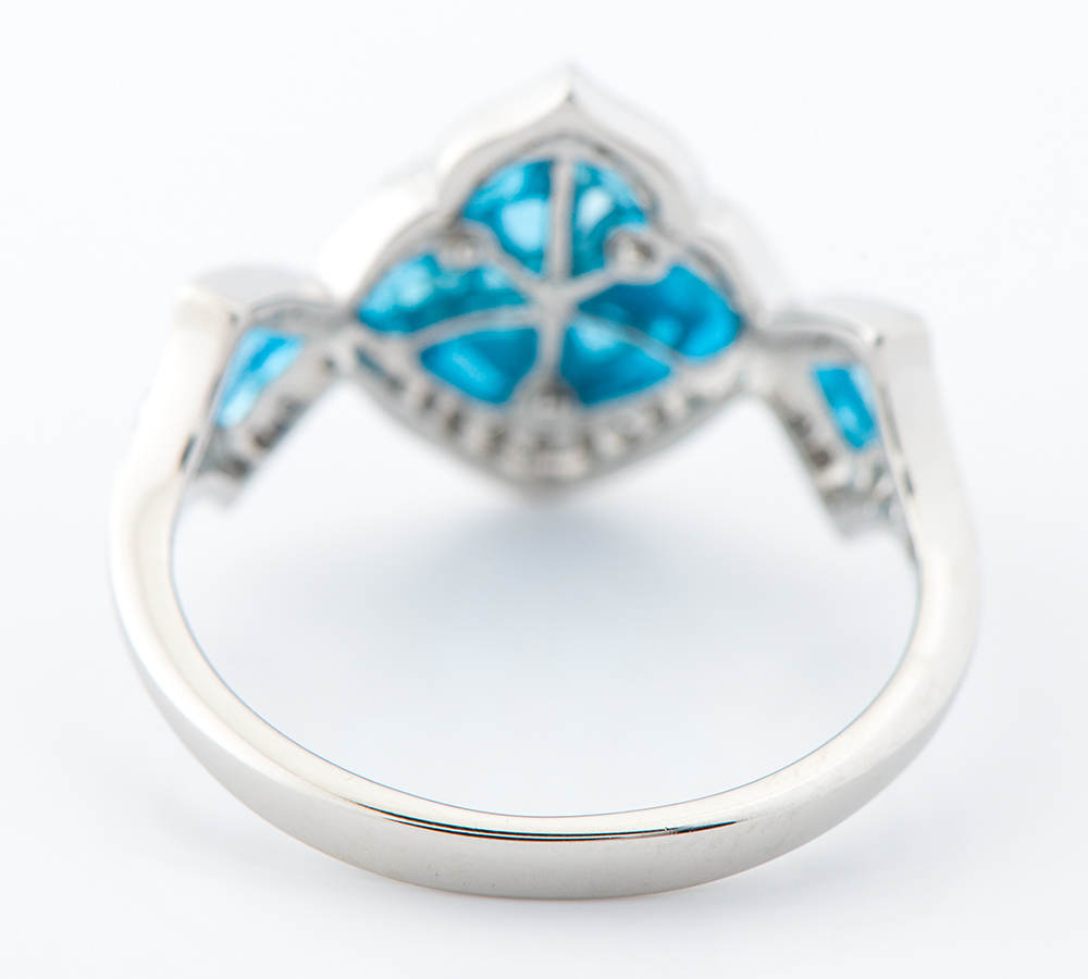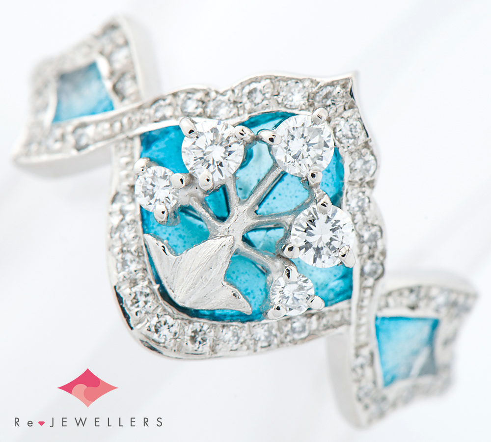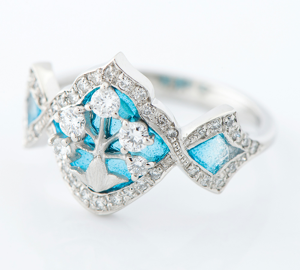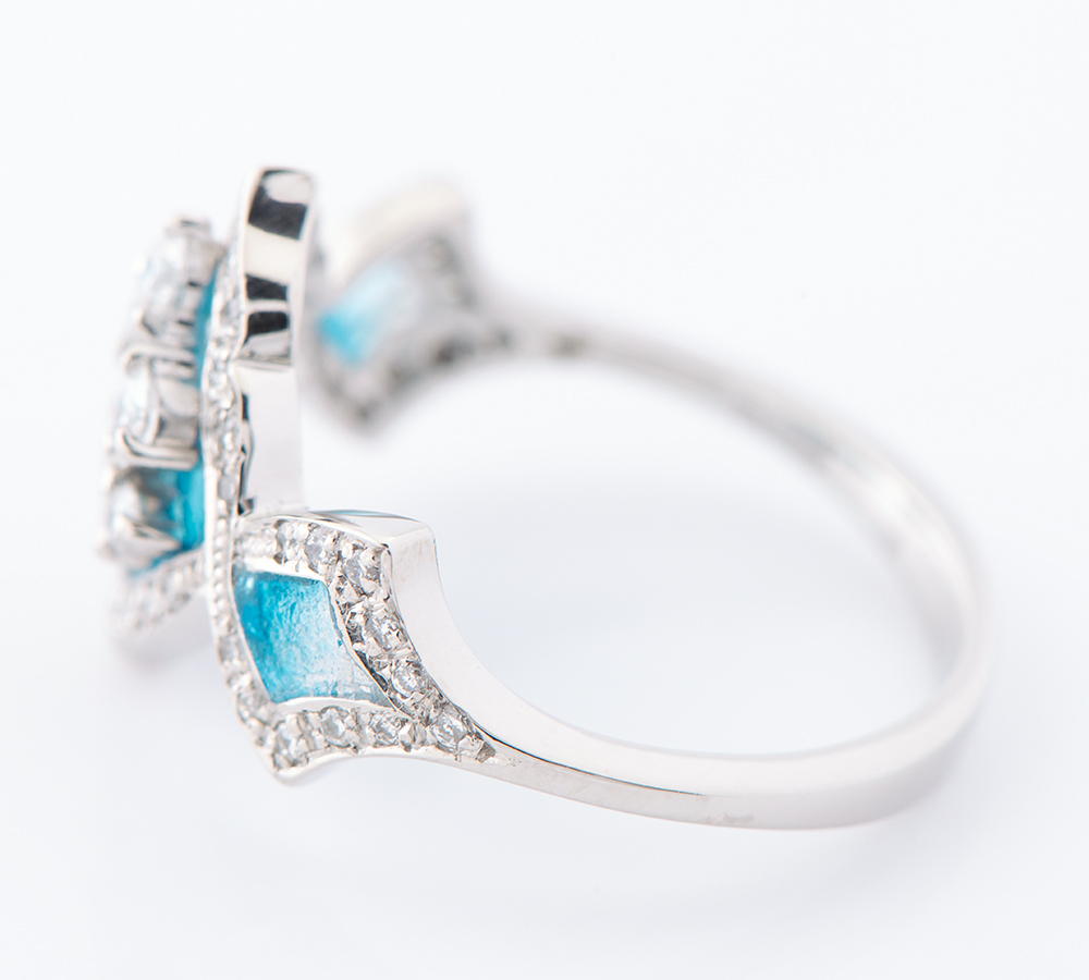 エマイユ技法を用いて独特の世界観を魅せる中嶋邦夫 ニックスファクトリー。クリアなブルーのエナメルが美しいリングです。個性的なデザインに、存在感のあるダイヤモンドの煌めきが華を添えます。ユニセックスでお使いいただける、気品溢れるジュエリーです。