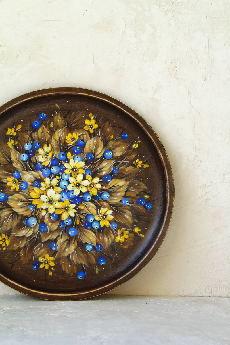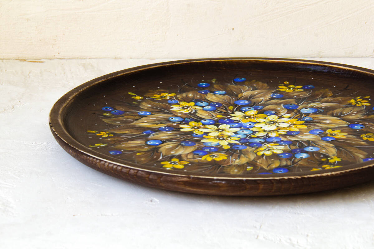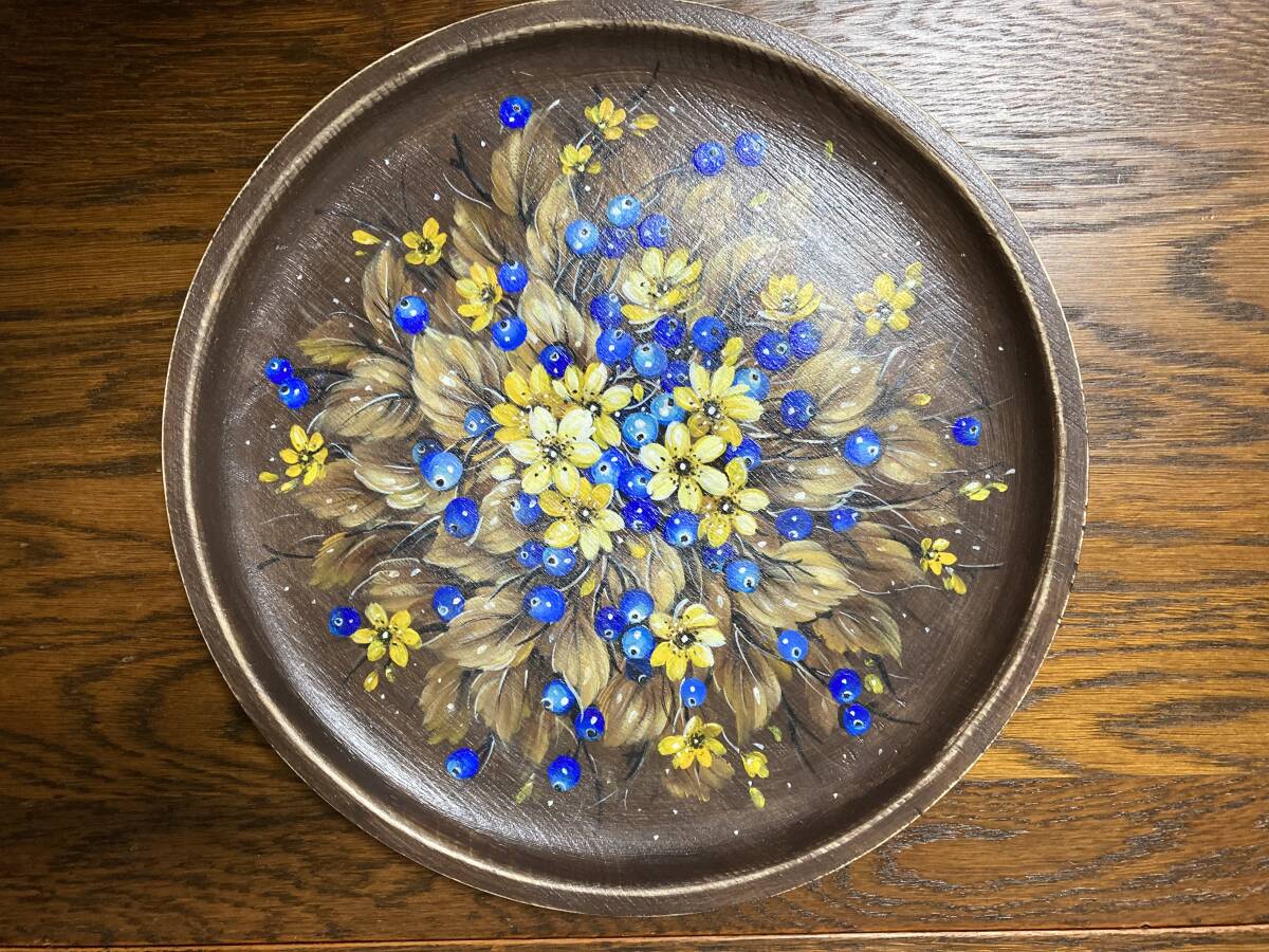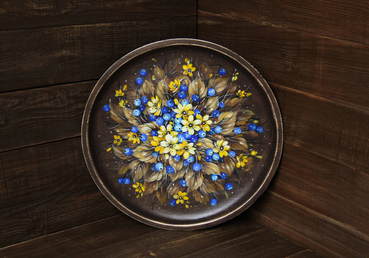 ロシア人ベレスタアーティストのガリーナさんがテンペラで描いた『セント・ジョーンズ・ワートの花とブルーベリー』のシャビーシックな木製飾り皿です。