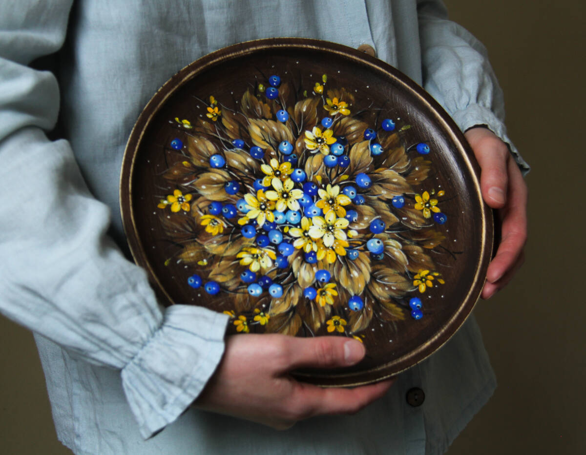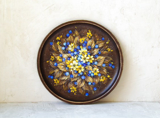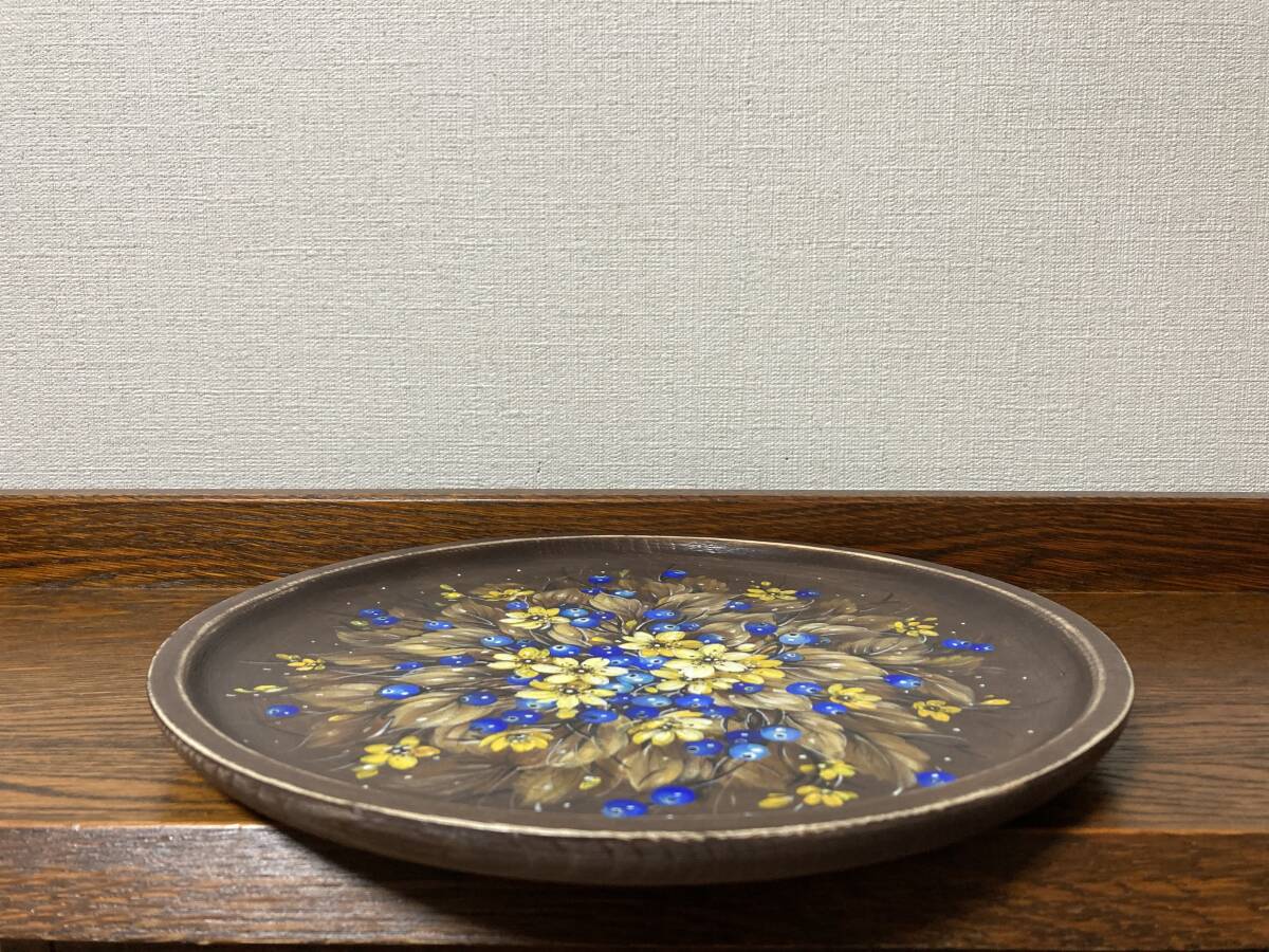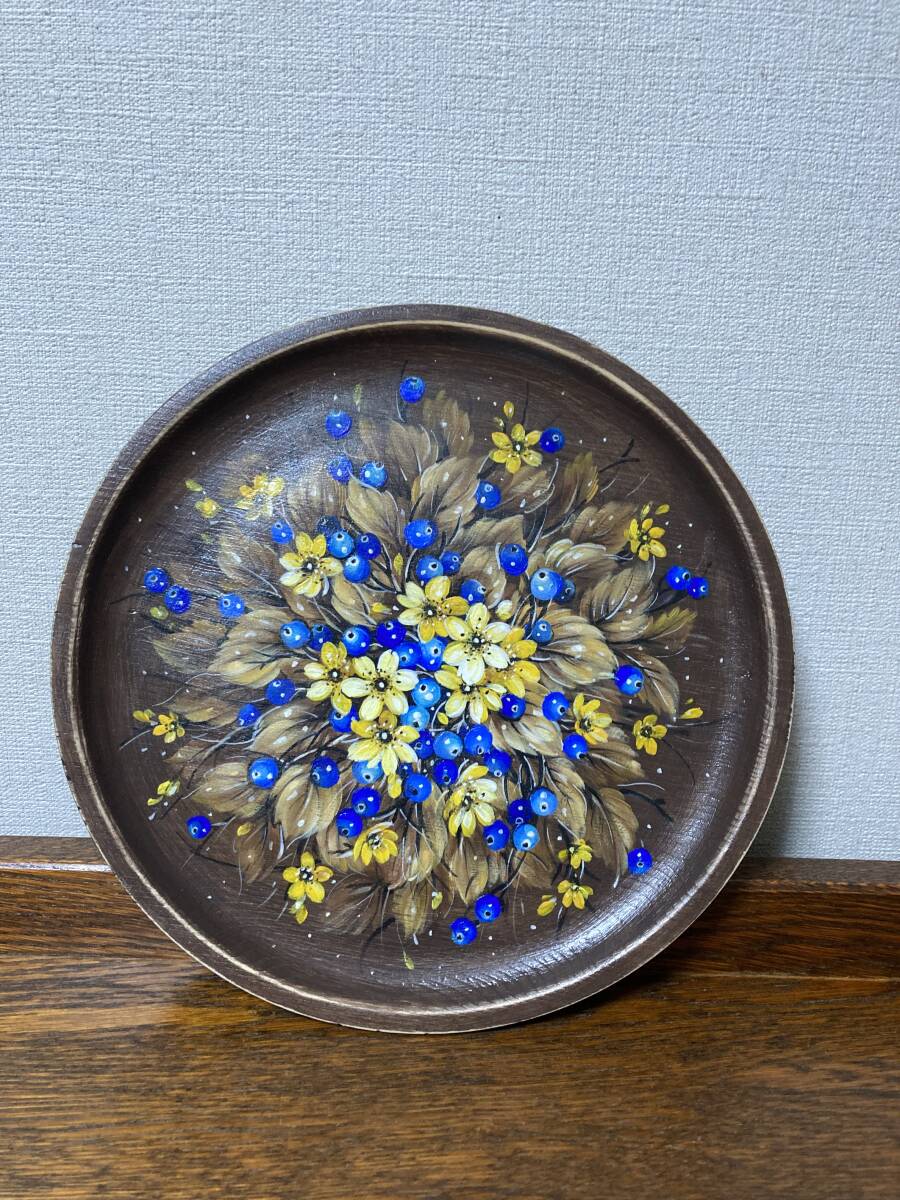 ロシア人ベレスタアーティストのガリーナさんがテンペラで描いた『セント・ジョーンズ・ワートの花とブルーベリー』のシャビーシックな木製飾り皿です。