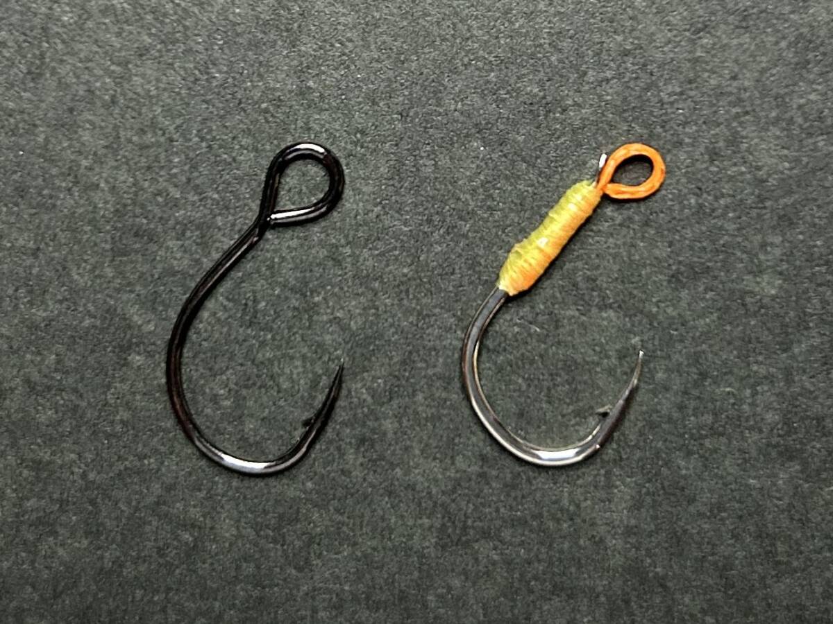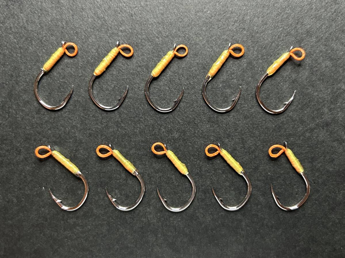 | トラウト用ハンドメイドスイミングフックです ルアーカラー別に制作しております お手持ちのお気に入りのルアーに装着してみてください! シルバーベースのチャートカラー用に製作したフックです チャートカラーも色々あるので、カラーパターンは今後変更または追加があるかもしれません 現在はこのカラーパターンで製作しております 個人的には素敵な組み合わせだと考えております 是非お試し下さい! フックサイズは、トラウト用ルアーのシングルフックサイズで制作しております サイズは3枚目の画像でお確かめ下さい 今回のフックは伊勢尼針を使用し、少し太軸です フックサイズ以上のトラウトがフッキングしても、まず伸ばされることはないかと思います 軸が少し短いので、アイのサイズを若干大きめに製作しております フックサイズ #4 フックカラー シルバー アイカラー オレンジ アイサイズ ノーマル アイ強度 PE-60lb スレッドカラー ライトケイヒル ヒネリ なし 品番 MSCH4 最も肝心なベースフックは、国内工場で生産された物から厳選し、伊勢尼 チヌ マダイ マス 丸セイゴ等のエサ釣り用フックを、サイズとカラーから選んで使用しております アイは、PEライン8本編み60lb以上をメインに、ケブラート バッキングラインからフックサイズ等に合わせて選択しております 多少傷が付いてもいいように、オーバースペックの太さの物を選択しております スレッドは、 ユニスレッド6/0をすべてのフックに使用しております 制作途中に6回以上フックサイズに応じてハーフピッチを施していますので、多少解れても大丈夫です すべてのフックは、接着剤で固定後、レジンコート加工しております スレッド幅は短め、ショートアイ仕様です 強度はしっかり実釣テストをしてますのでご安心下さい すべてのフックは、自然渓流でテストしています こちら北海道のため、対象魚がニジマス アメマス イトウとなり、#6のフックは、アメマスのサイズ35cmまでが、それ以上のフックは、40cm以上のニジマスが、1,2回ジャンプされても獲れる物の組み合わせを、実釣テストで見極め最適化したものを販売しております #6未満のフックは、本州の、ヤマメ イワナ等で使用されることをイメージして制作販売してますが、こちらではあまりテストにならないので、購入後気になることがあれば、お教え下さい 今後の制作に生かしたいと思います フックが鋭いため、向こうあわせでフッキングすること多く、大きくあわせると口がきれて逆にバレることがあります 追いあわせを入れる時は魚のサイズにご注意下さい ミノーサイズに対して少し大きめのフックは、前後フックが絡まったり、腹フックが背中に刺さったりすることがあります、ストレスを感じることもありますが、5cm前後のシンキングミノーにフックセットされる場合、#8くらいのフックだとトラブルは軽減されると思いますが、大型のマスが生息している場所では、せっかくの大物をバラす確率が高まります 大は小を兼ねると言います ご考慮願います また自作経験のある人は感じたことがあると思いますが、エサ釣り用のフックは、直に岩や木などの障害物に当たり擦れることを考えて作られていないので、シンキングミノーやスプーンで川底を転がすようなパターンや、岩の入った浅めの瀬を横切らせるようなパターンを多用するとルアー用フックより針先が鈍りやすいと感じてます 私は600番くらいの紙やすりを1cm角くらいに折った物をルアーケースに忍ばせ、少しでも鈍りを感じたら、その場で研いで使ってます がまかつさんのHPで、簡単な研ぎ方が紹介されてますので、是非ご覧ください 1本ずつ手作りで、確実に獲れることをメインで制作しているため、商品の見た目にばらつきがあります ご了承下さい 十分に検品後発送致しますが、商品到着後、フックが甘い スレッドが解れてるなど 釣果に関わる不具合がある場合は、返品交換致します ご連絡下さい 送料無料 普通郵便で発送いたします その他の発送方法をご希望の方はご相談下さい!【別途費用が発生致します】 | |||