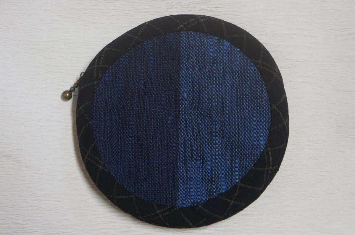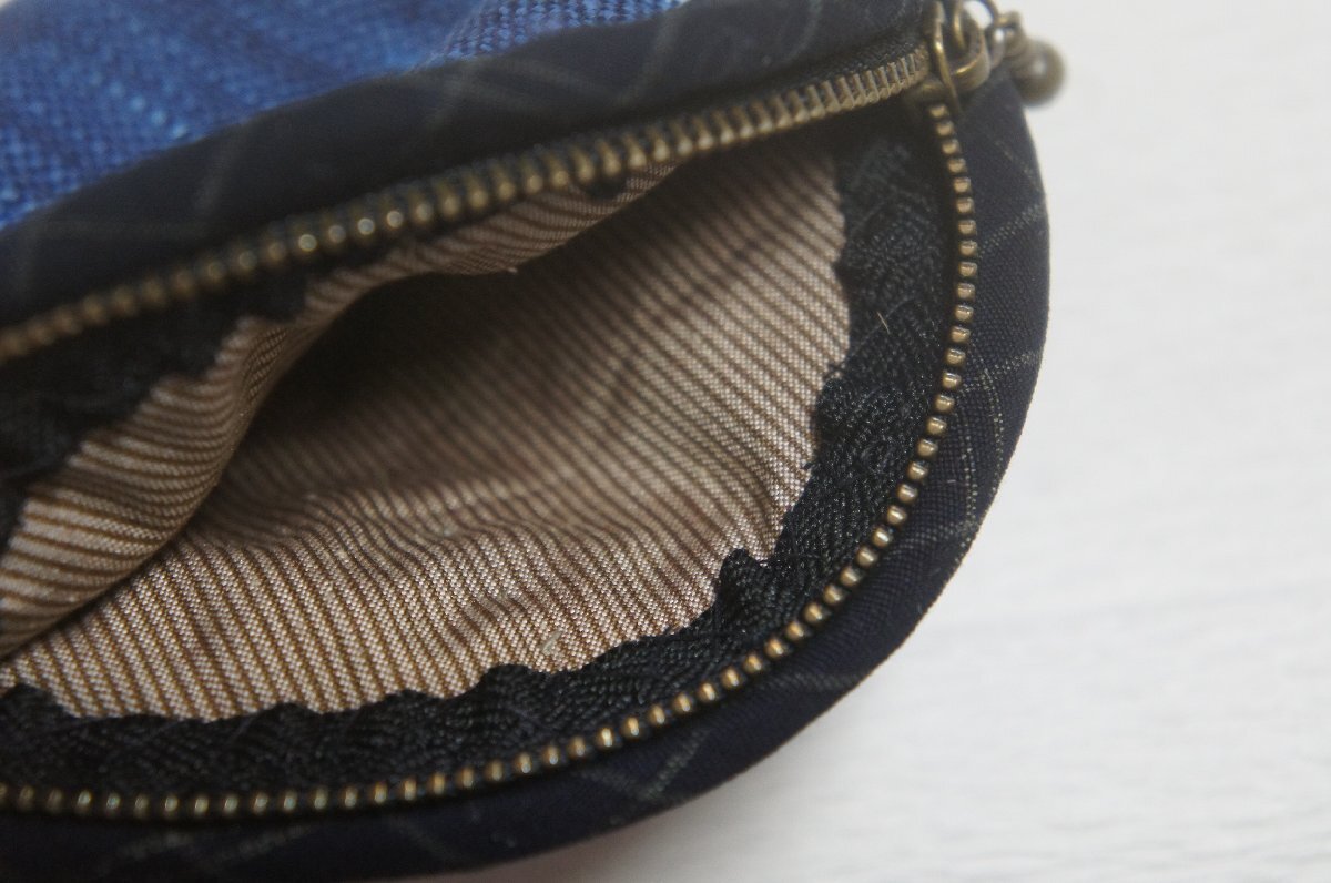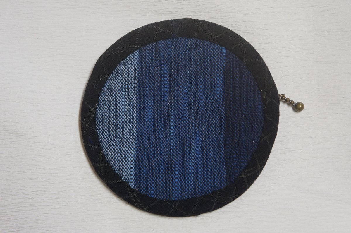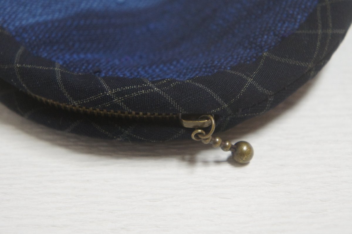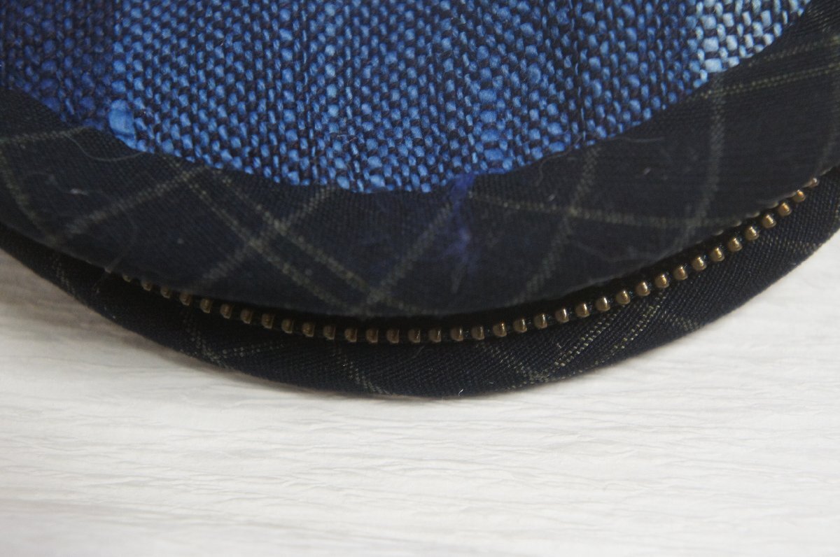 柄附経節紬紺色濃淡地丸型ポーチファスナー付き