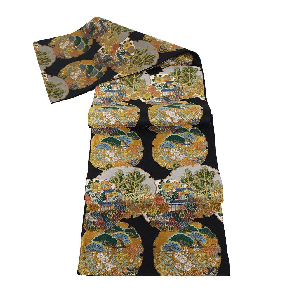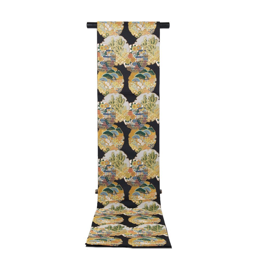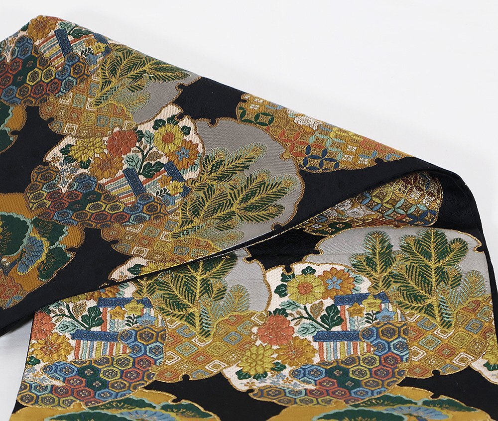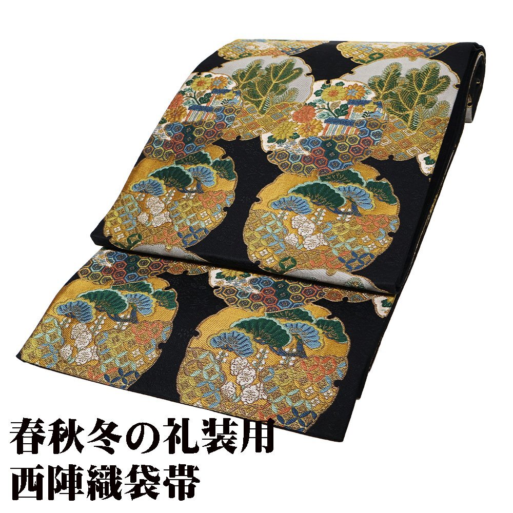 | 西陣織袋帯 黒地 縫い取り・松竹梅・亀甲文・七宝文・雪輪文 未使用品 仕立て上がり |