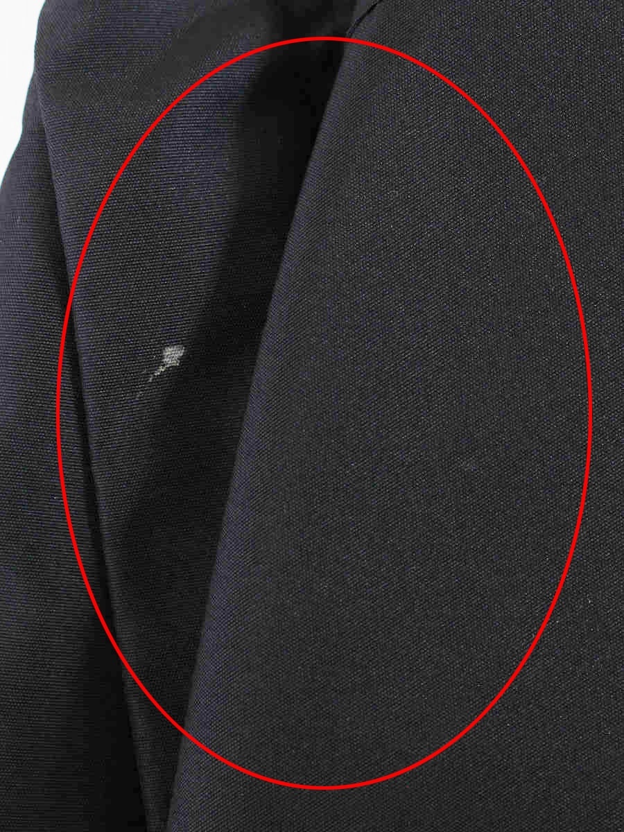 【汚れ・シミ】正面右上部、背面ウエストまわり、背面右下部などに色付きがございます。
