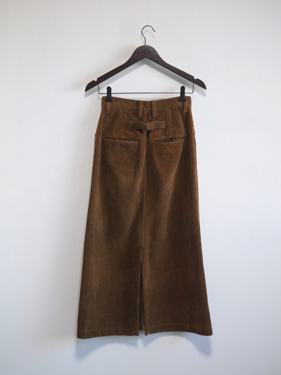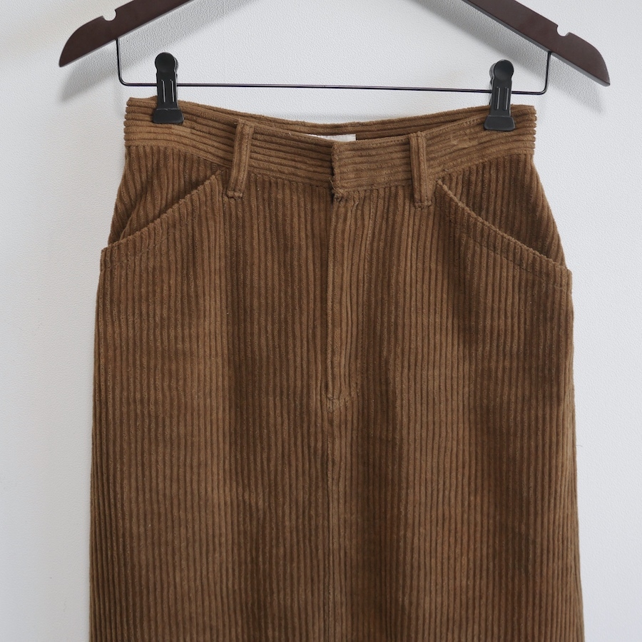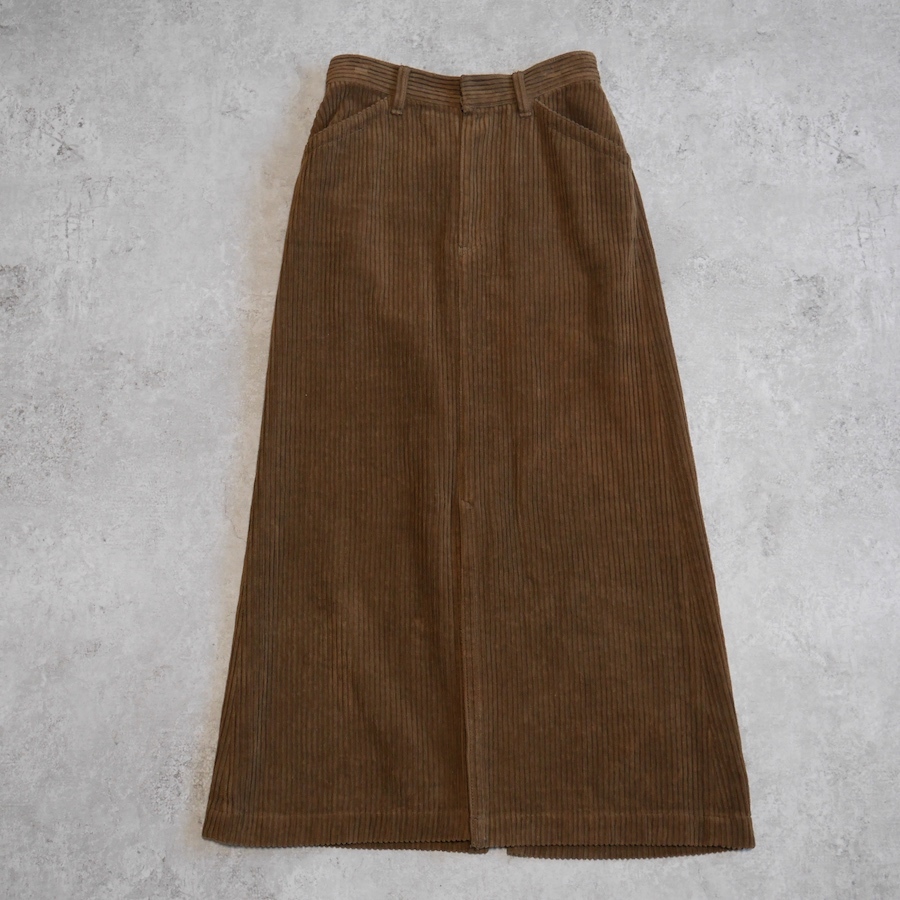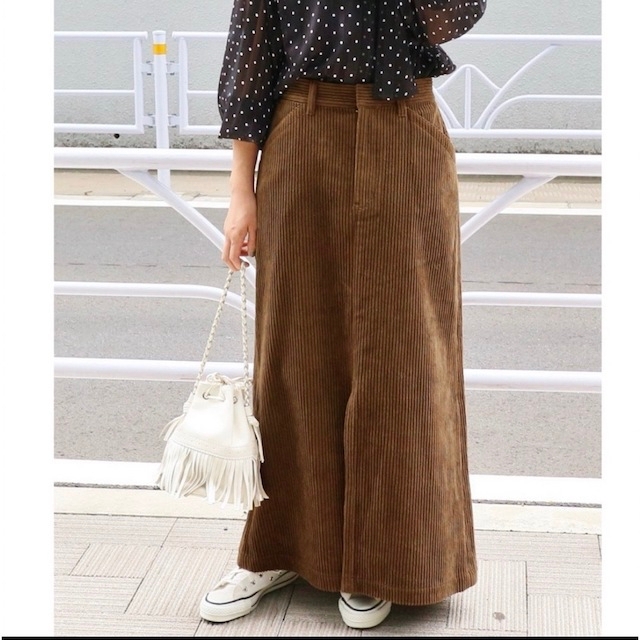 柔らかな風合いの太畝コーデュロイ素材のロングスカート。 前後に大きなスリットが入っているため足さばきもよく、動きづらさもありません。