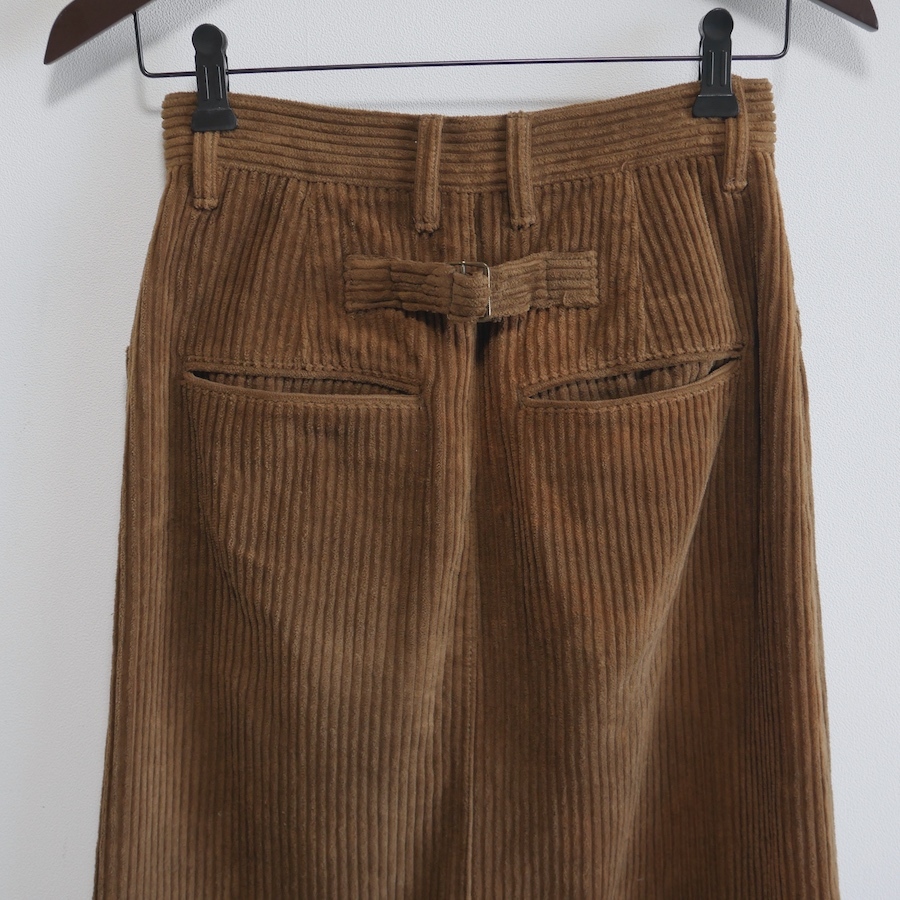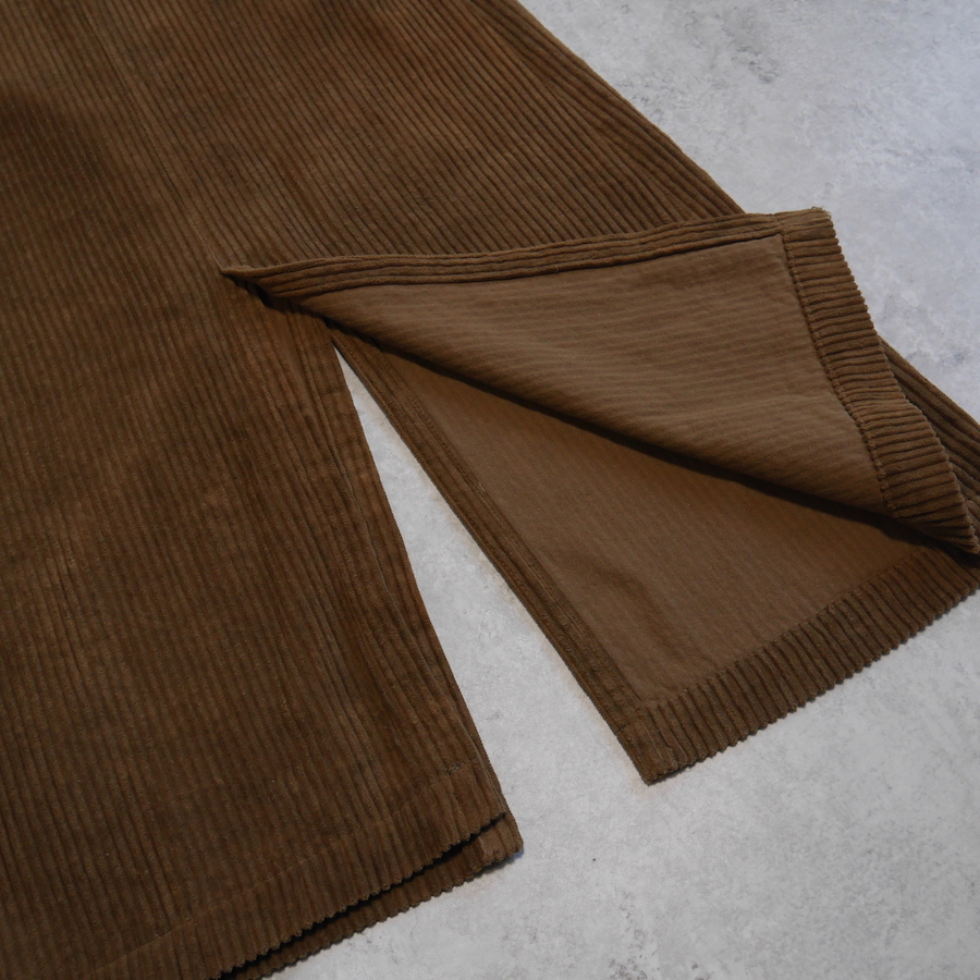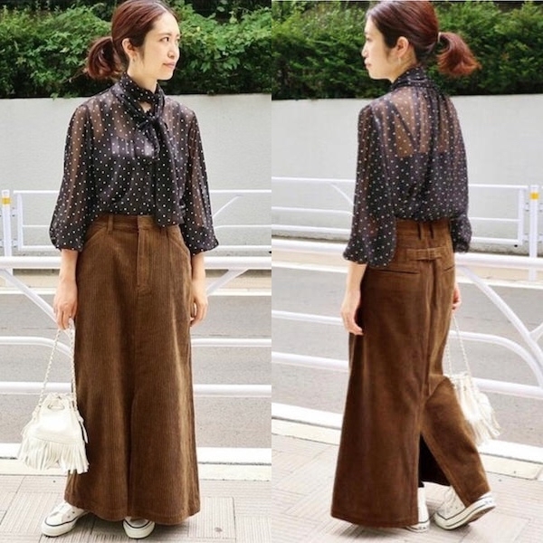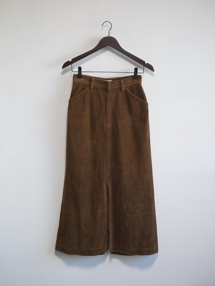 柔らかな風合いの太畝コーデュロイ素材のロングスカート。 前後に大きなスリットが入っているため足さばきもよく、動きづらさもありません。