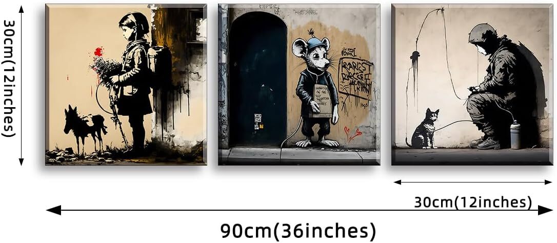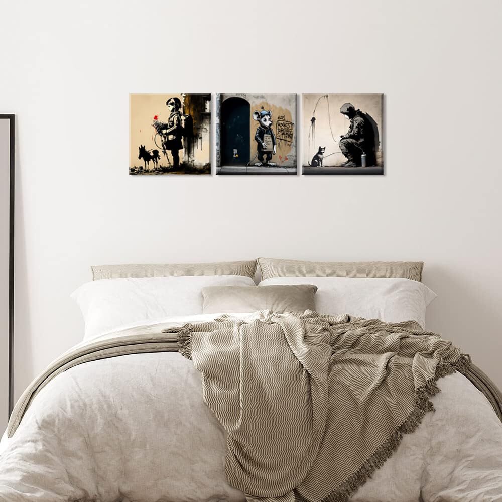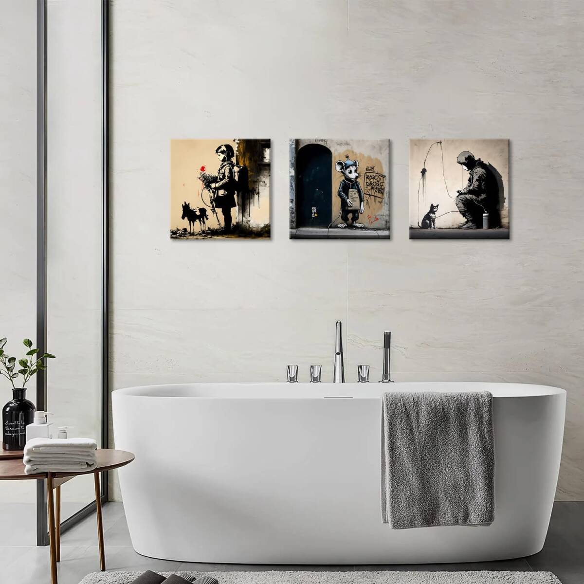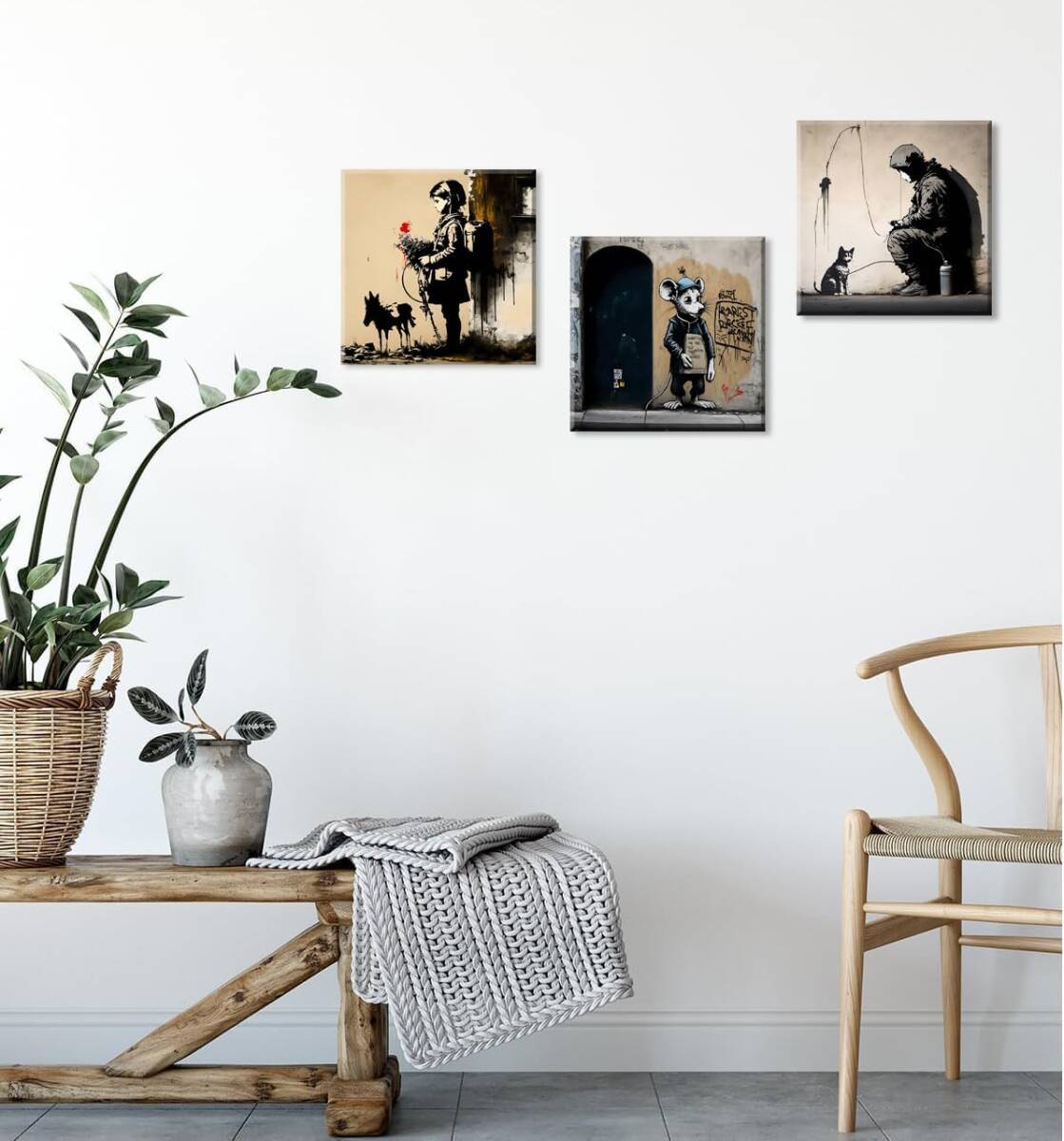 3枚セットのアートパネルで、ランドセルの女の子、猫と老人、動物をモチーフにしたモダンな絵画です。