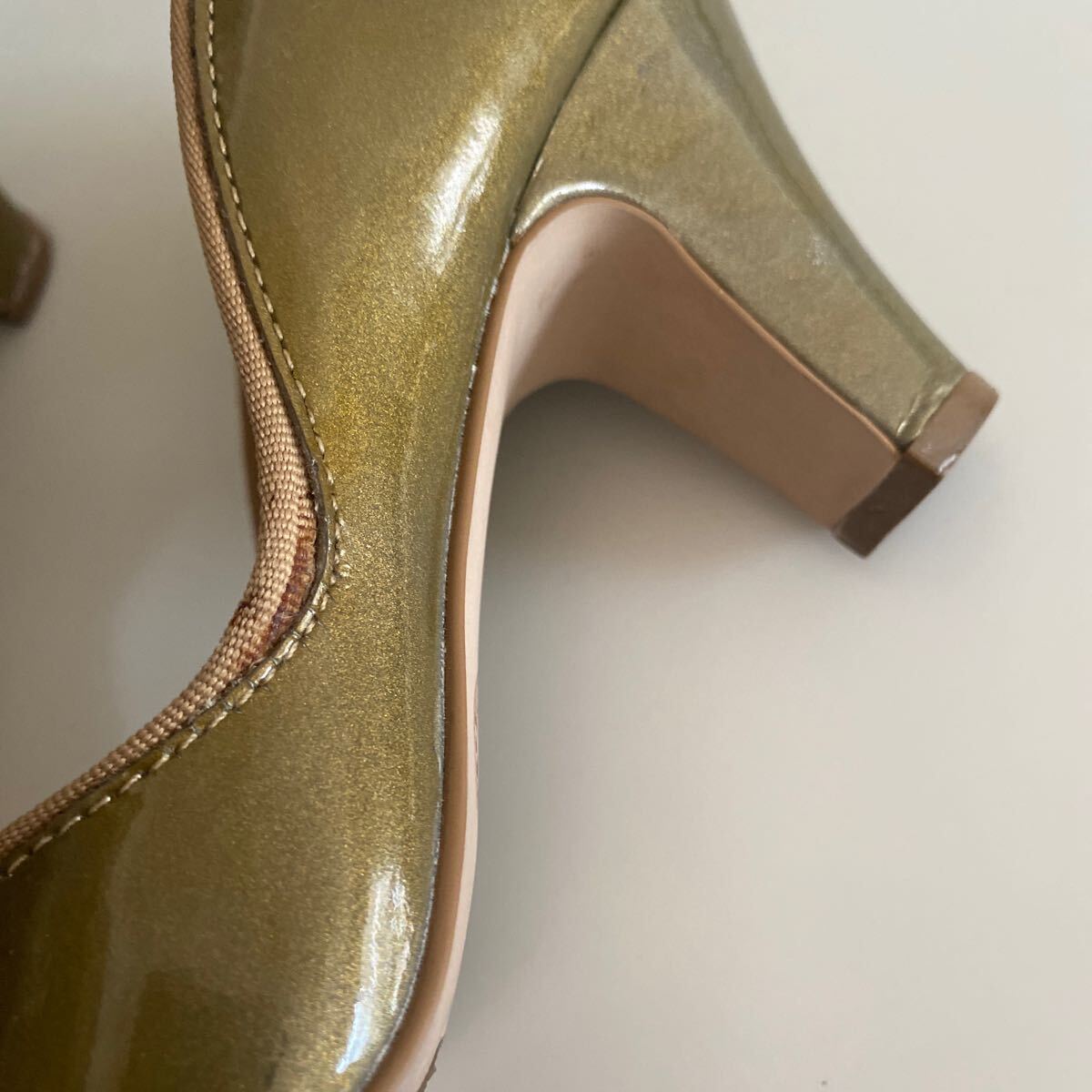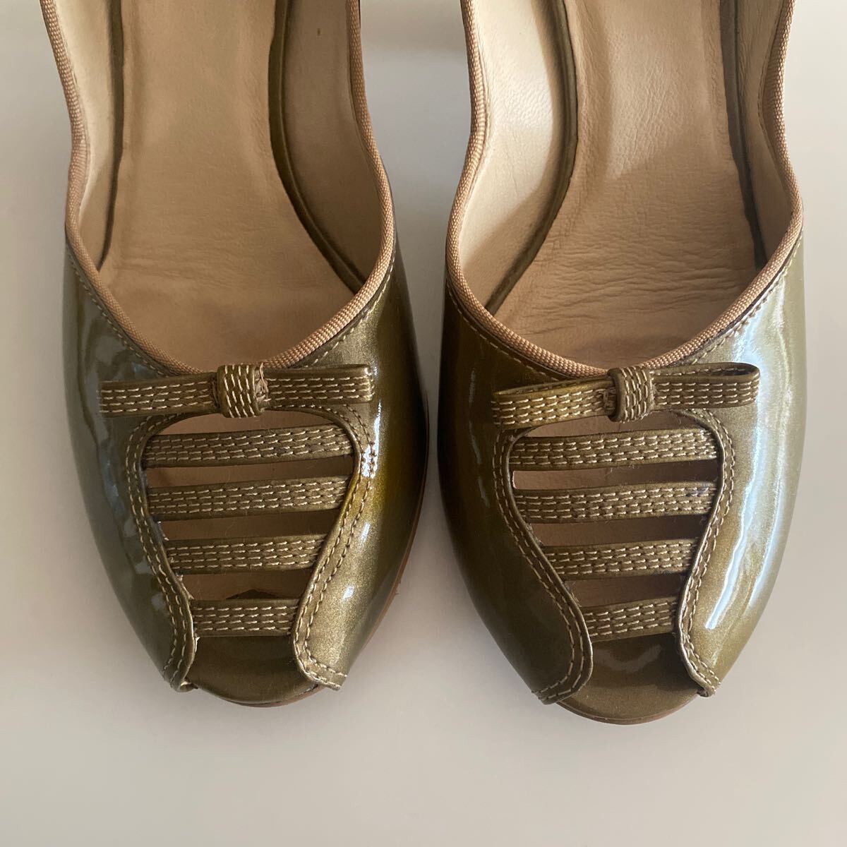 オリーブグリーンのような、またゴールドのようにも見える色合いがなんとも綺麗でどんなコーディネートにも合わせやすく、オープントゥパンプスとストラップデザインが足元を華やかに演出してくれます。
