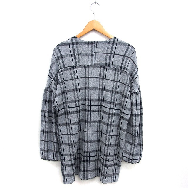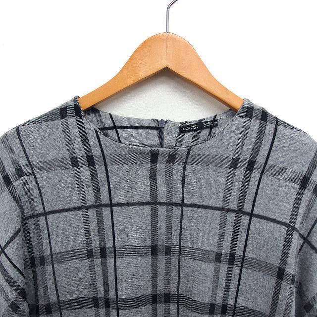 ザラ ZARA ワンピース Iライン ミニ コットン 綿 チェック ドロップショルダー バックジップ 長袖 M グレー /NT28 レディース