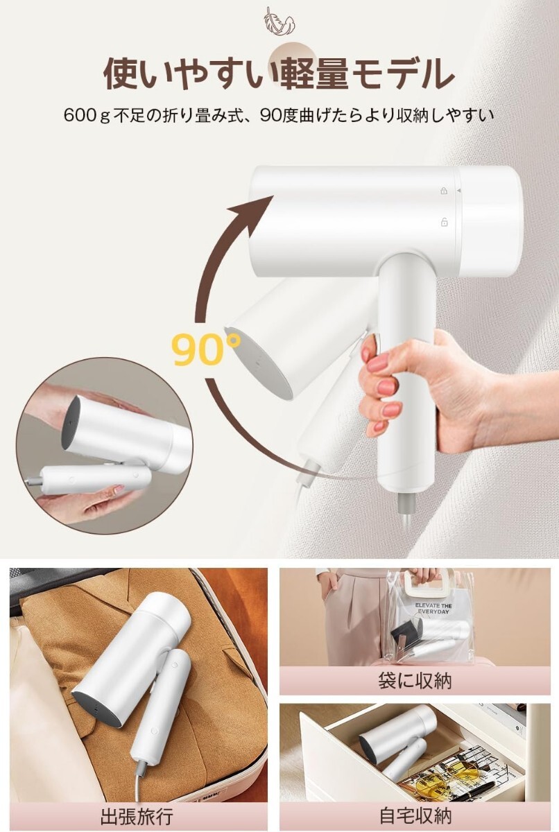 【折り畳み式・携帯軽量アイロン】 コンパクトな折り畳み式(90°曲げられる)の小型スチームアイロンです。水を入れても690gと、操作が安定し、手元の負担を軽減します。持ち運びがやすいので、自宅だけでなく、旅行先や出張先にも使用できます。主婦や一人暮らしの学生、社会人に最適です。