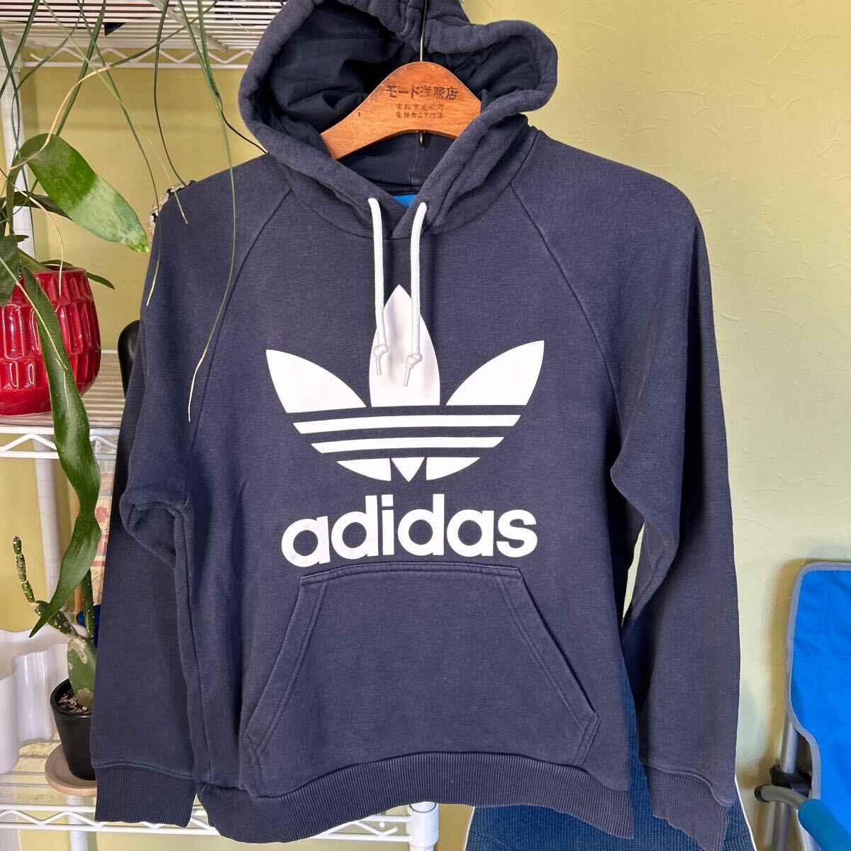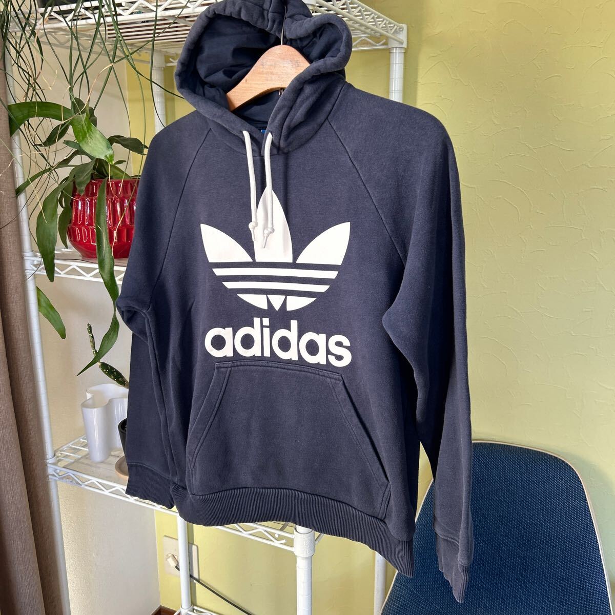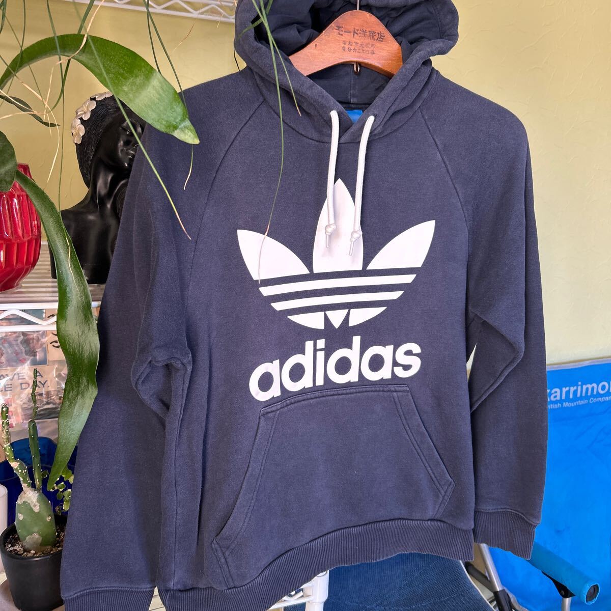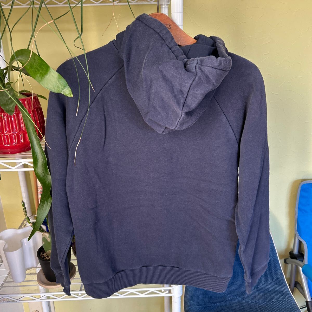 袖丈56(脇下縫目〜袖先端)多少の誤差はお許しください。良い雰囲気です。綿ポリ混紡のスウェットパーカ トレフォイルプリント できる限りダメージは説明させていただきますが、こちらが気づかない程度のわずかなしみ、よごれ、
