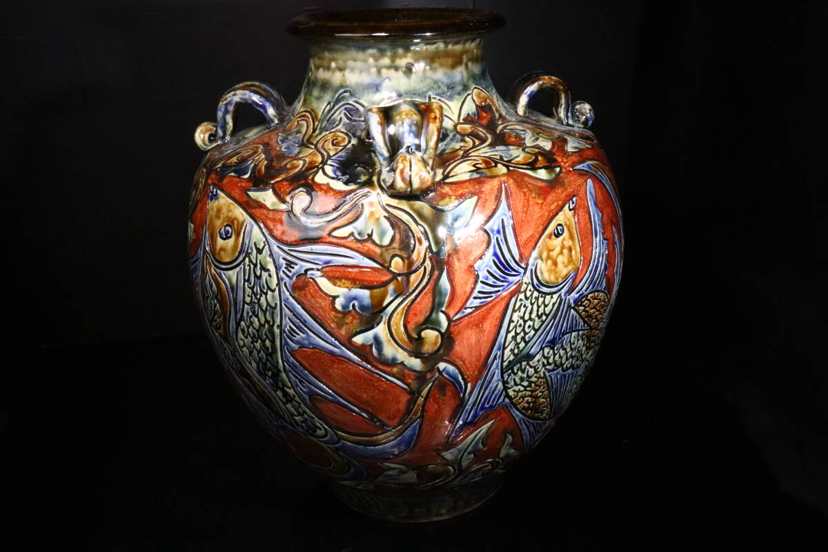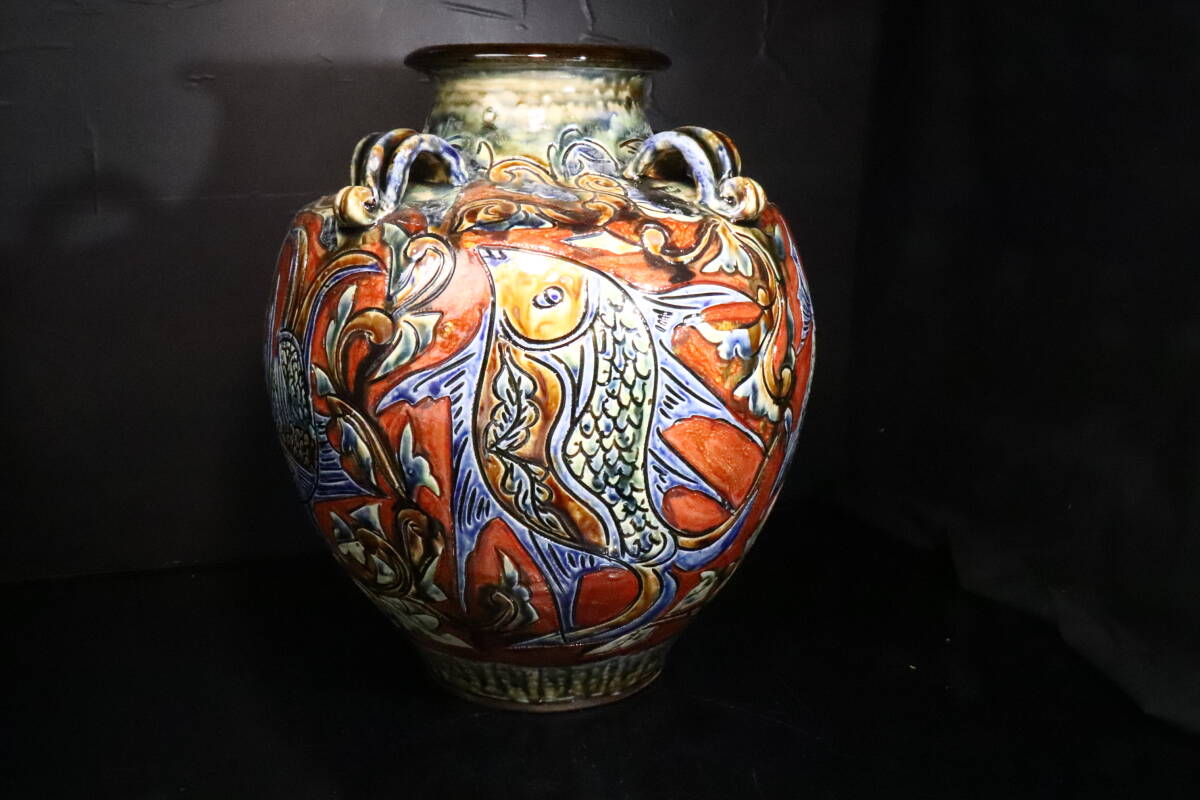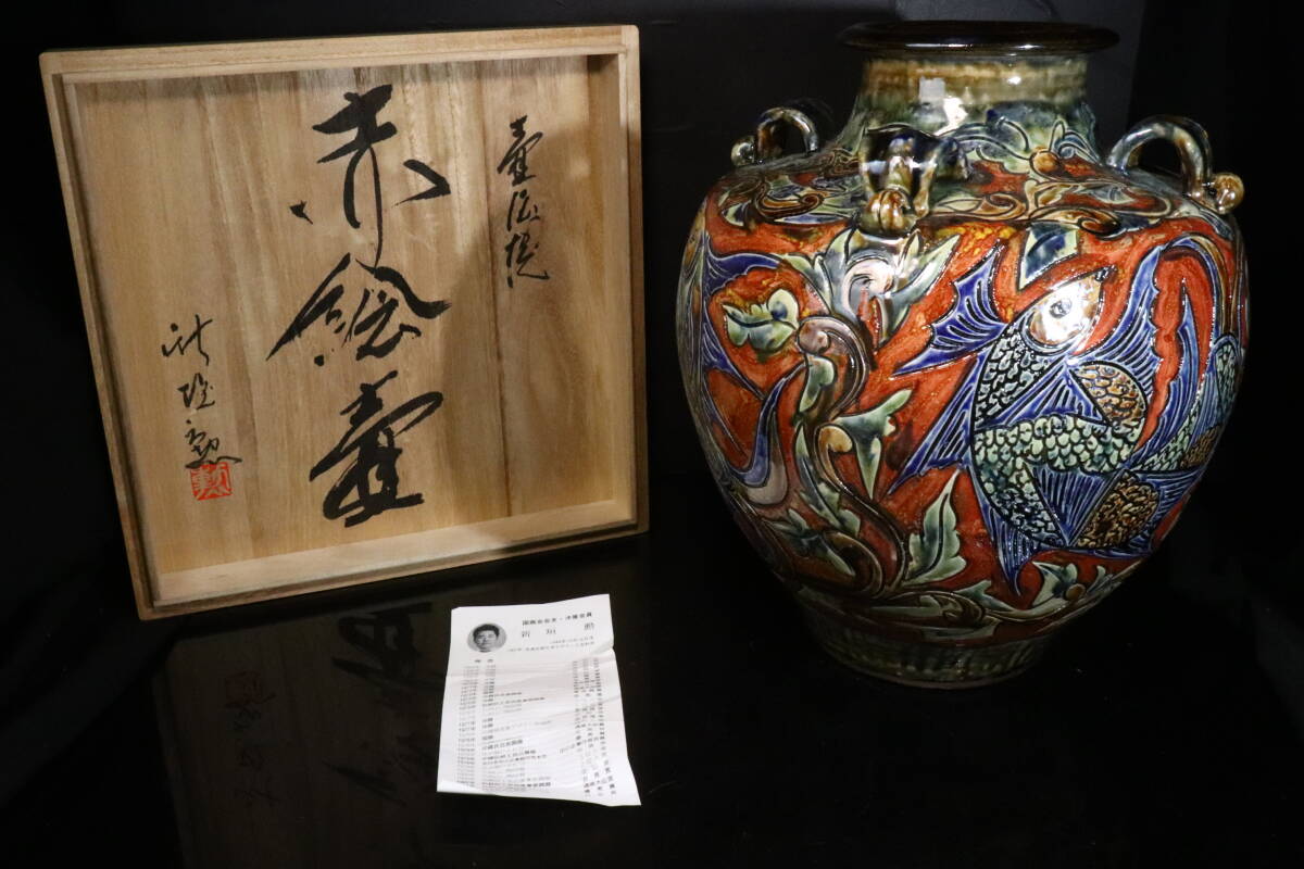 | 品名:赤絵魚紋四耳大壷 作家:新垣 勲 寸法:約 直径 32cm×h 36.2cm 状態:傷など無く綺麗な状態です。 付属:共箱、栞 ★作品説明★残念ながらお亡くなりになられた壺屋の現代の名工新垣勲さんの滅多と無い最上級手と言っても過言ではない名品の大壷です!迫力ある造形に色鮮やかに削り出された魚紋が作品全体を埋め尽くす!作品全体が見どころの逸品です!! どうぞ宜しくお願い致します。 また、他でも販売しておりますので終了する場合があります。 ★(入札がない場合にのみです。)ご興味のあるものはお早めにお願い致します。 数あるオークションの中からご覧頂き有難う御座います。 以前にオークションをさせてもらっておりました(評価実績1800ほど) 不慣れな点は多々あると思いますがお客様を一人でも多く、笑顔で喜んで頂けるよう 努力してまいります。どうぞ宜しくお願い致します。 ※ご入札前に必ず御読み下さい!! ・作品の状態などは画像にて判断をお願い致します。 ・ご利用のモニターにより多少 色彩などの違いは生じます。 ・基本的に古物ですので、新品の様な状態を希望の場合はご入札をご遠慮下さい。 ・新規のID、悪い評価の多いIDのご入札は事前に質問等よりご連絡ください。 ご連絡無き入札の場合入札者の取り消しをさせて頂きます。 (評価の非常に悪いの内容にても判断致します) ・基本的にノークレーム・ノーリターンでお願い致しますが説明に無い傷等あれば返品に応じま すのでご連絡下さい。 ・落札後24時間以内にお取引開始をお願い致します。お取引開始が無い場合はご連絡をさせて頂 きますが、それでも返答がない場合は取り消し処分とさせて頂きます。お取引開始後、3日以 内のご入金をお願い致します。こちらもご入金がない場合は取り消しとさせて頂きます。以上 の厳守頂けなかった場合はブラックリストへ登録し以後お取引は行いません。(入札し、以後 ご連絡の無い無責任な代行業者の方が多いためです!) ・作品を受け取りになったら、すぐにヤフオクより受け取りのご連絡をお願い致します!!! かんたん決済のシステム上、ご連絡がないと代金の受け取りが出来ないためです。 ★以上の事を厳守できる方のみ!ご参加お願い致します。★ また古美術hiroではインスタグラムも掲載しておりますので、宜しければフォローの方 宜しくお願い致します。ID:kobijyutsu_hiro ★出品作品はお値引き可能な作品も御座います、作品の状態など どんな事でもお気軽にご質問下さい。インスタグラムへDMをして頂いても結構です。 どうぞ宜しくお願い致します。 | |||