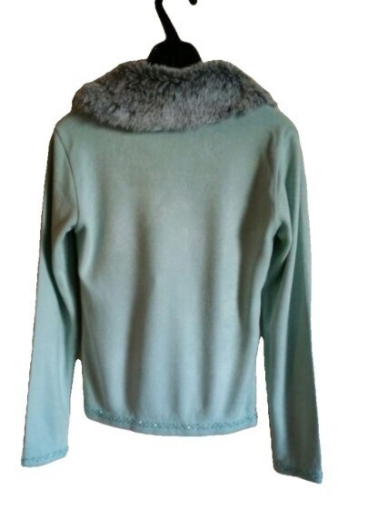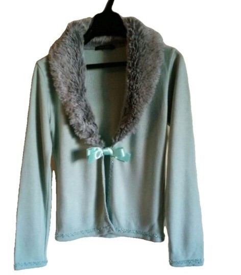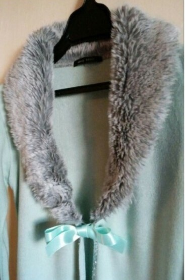 リュクスな淡いグレーのファーとニットの水色が上品です。