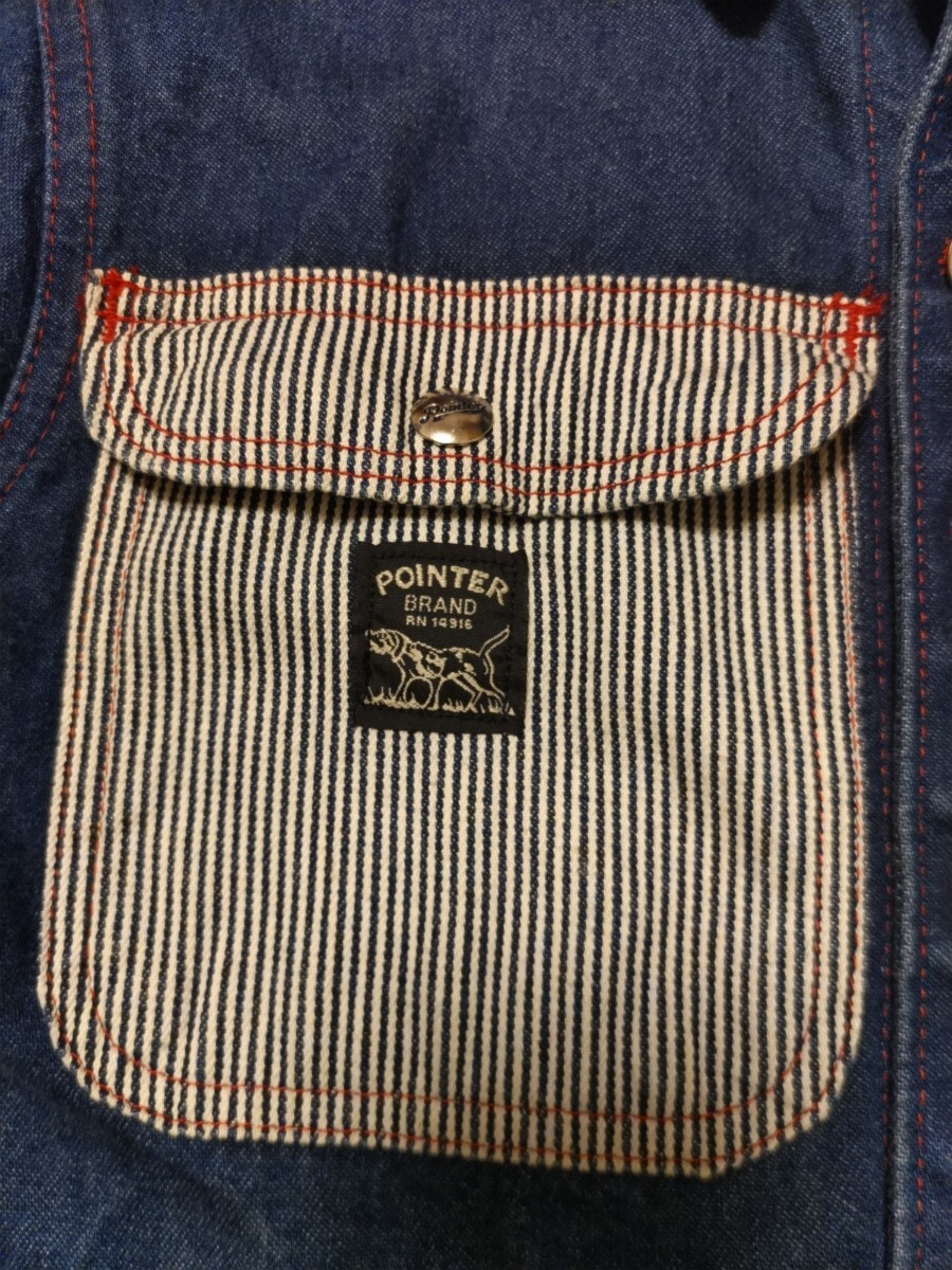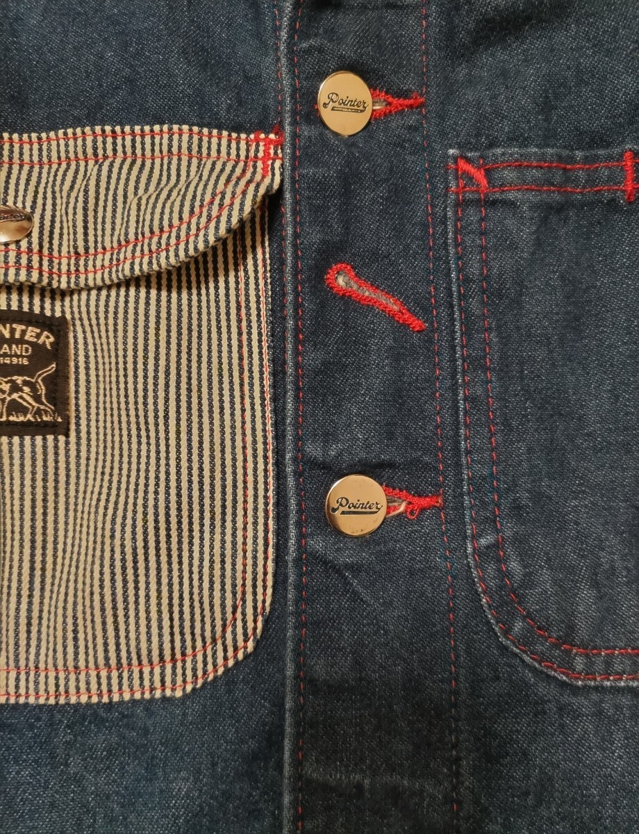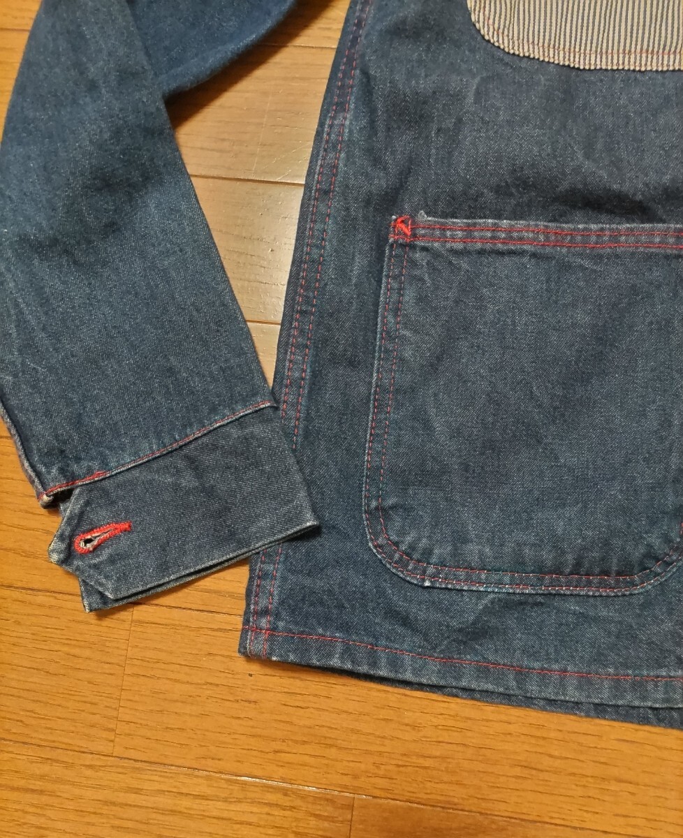 ポケットにヒッコリー素材を使用しておりデザインがとてもかっこいいです。縫製に赤い糸を使っており他のブランドにないデザインだと思います。