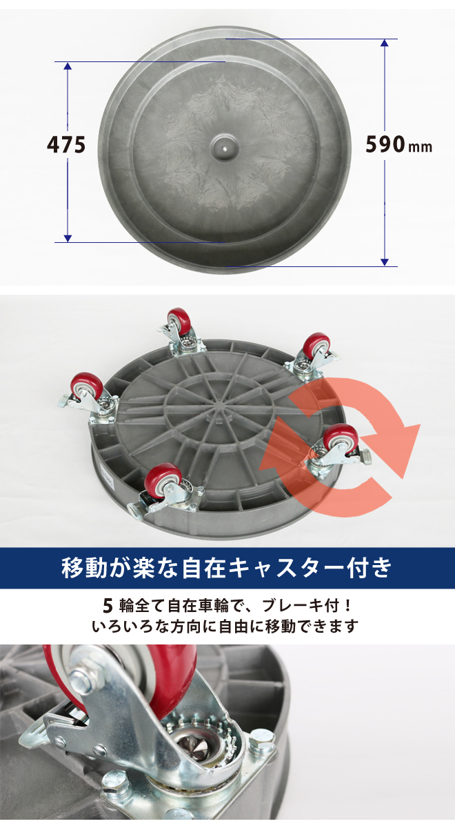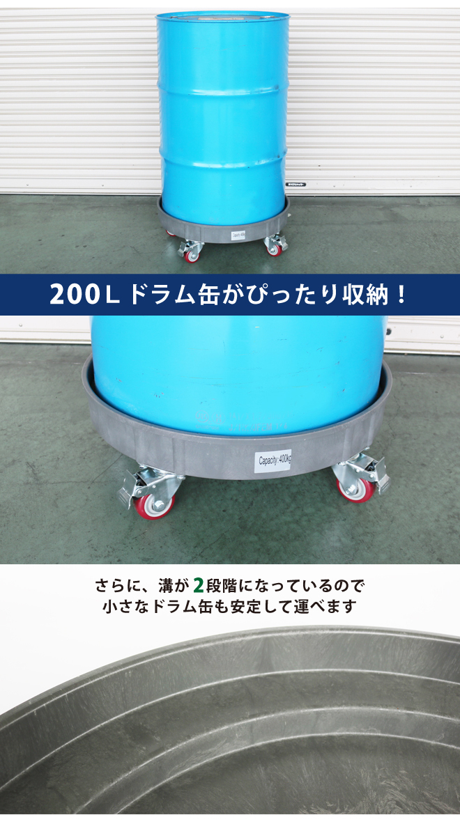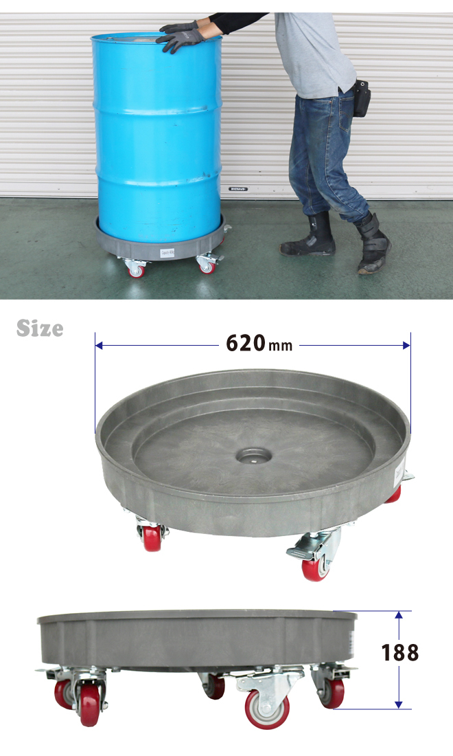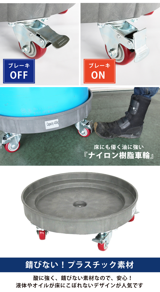 ●酸に強く、さびないプラスチック素材を使用した、ドラム缶ドーリーです ●一体構造なので、液体やオイルが床にこぼれません ●200Lドラム缶の他に小さなドラム缶も運べるよう、溝が2段階になっています ●裏面には補強を施してあるので、強い強度でドラム缶を支えます ●キャスターには床にも優く油に強い、ナイロン樹脂を使用しています ●5個の車輪すべてブレーキ付きなので、安心かつ安全にドラム缶を運べます また、勾配のある所でも固定できるので、自然に移動するのを防ぎます ●自在キャスターはいろいろな方向に移動でき便利です ●キャスターのみお客様での取付けとなります (5分程度、取付け工具は付属しておりません ) |