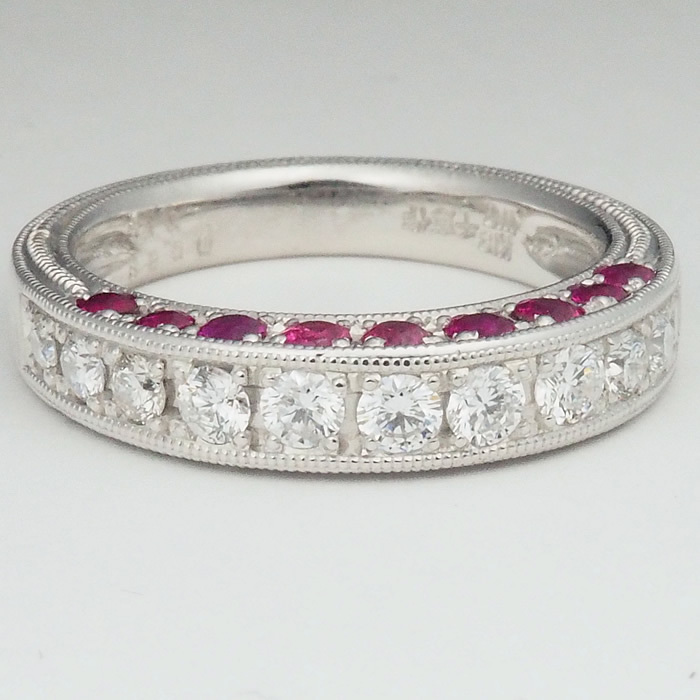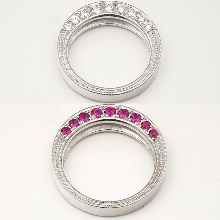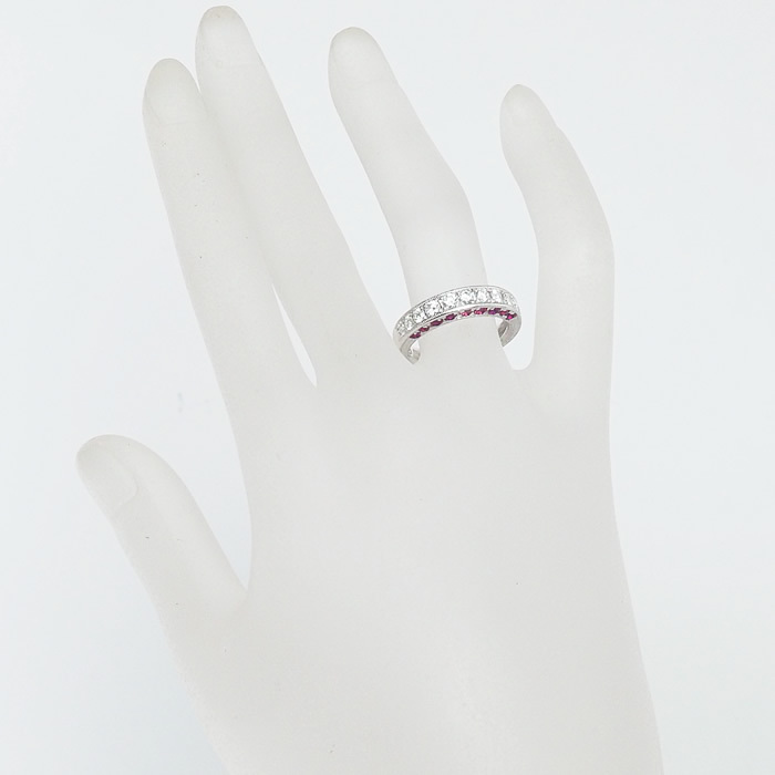ルビーとダイヤモンド仕立てた、18金ホワイトゴールド製のクラシカルなリングです。