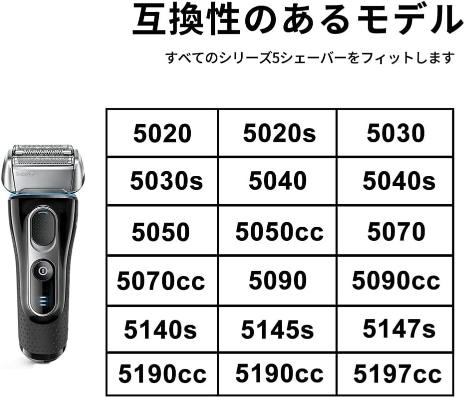 対応機種:ブラウン シリーズ5対応、5020/5020S/5030/5030S/,5040/5040S/5050/5050CC/5070/5070CC/5090/5090CC/5140S/5145S/5147S/5190CC/5748/5749/5147S/5140 /5145シェーバーと互換性があるブラウンシェーバー替刃です。その他、F/C52B、F/C52Sに対応するすべてのシェーバーでご利用できます。