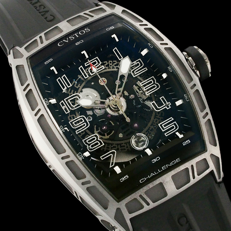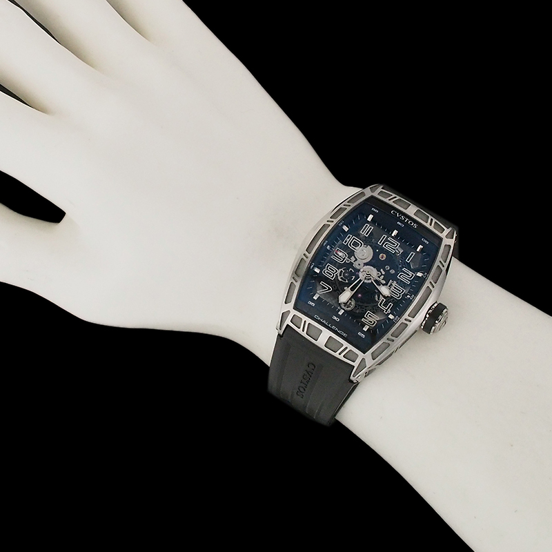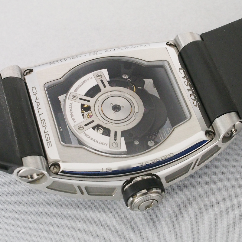 備考:ホワイトカラーの縁取りのみでデザインされたアラビアインデックスにスケルトンフェイスがとてもクールな「チャレンジ ジェットライナー」。ガラスコーティング膜に剥がれが見られますが、独創性溢れるケースデザインとケースバックとスケルトンフェイスから自動巻ムーブメントが堪能できるお洒落な一本です。