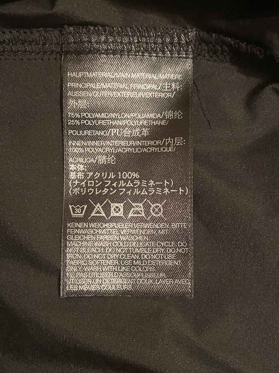 色は黒、表示サイズS、実寸は胴幅42、裾幅16、渡幅35、股上37、股下61、総丈92㎝位のクロップドで、素材はウレタン100%、かなりストレッチ性があります