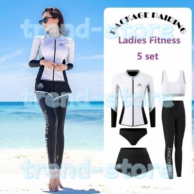 フィットネス水着 レディース 上下セット ワンピース水着 長袖 水陸両用 ジム スポーツ スイムウェア UVカット 5点セット 女子 サイズXL