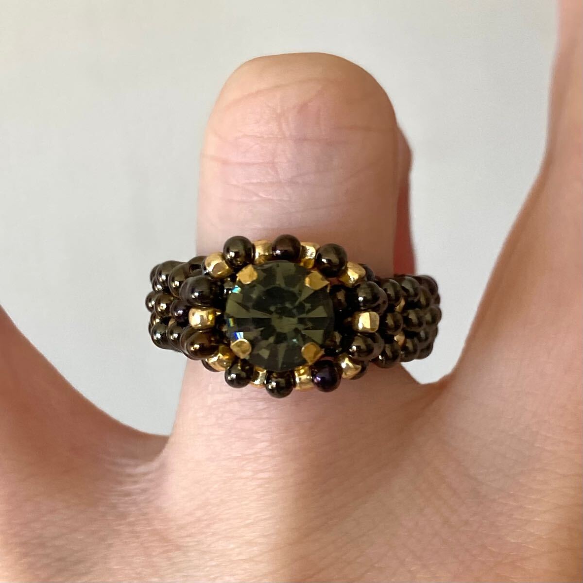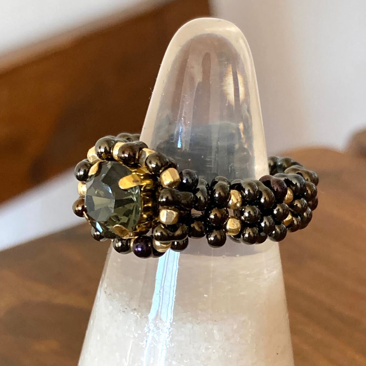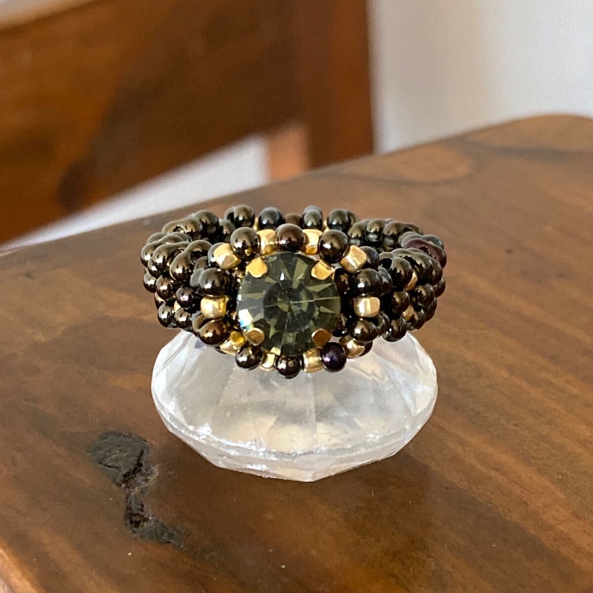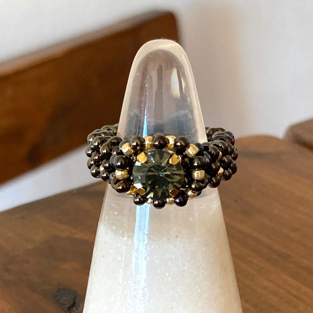 8mmのグレーのラインストーン、カーキブロンズ系のファルファーレビーズ、ゴールドのスリーカットビーズで作ったリングです。