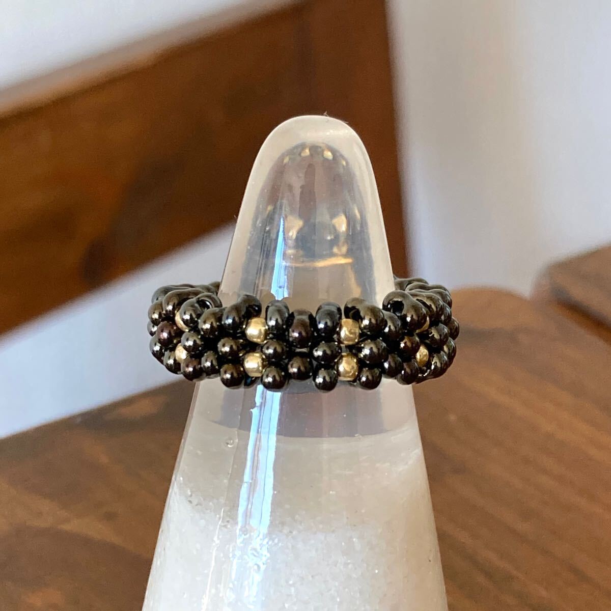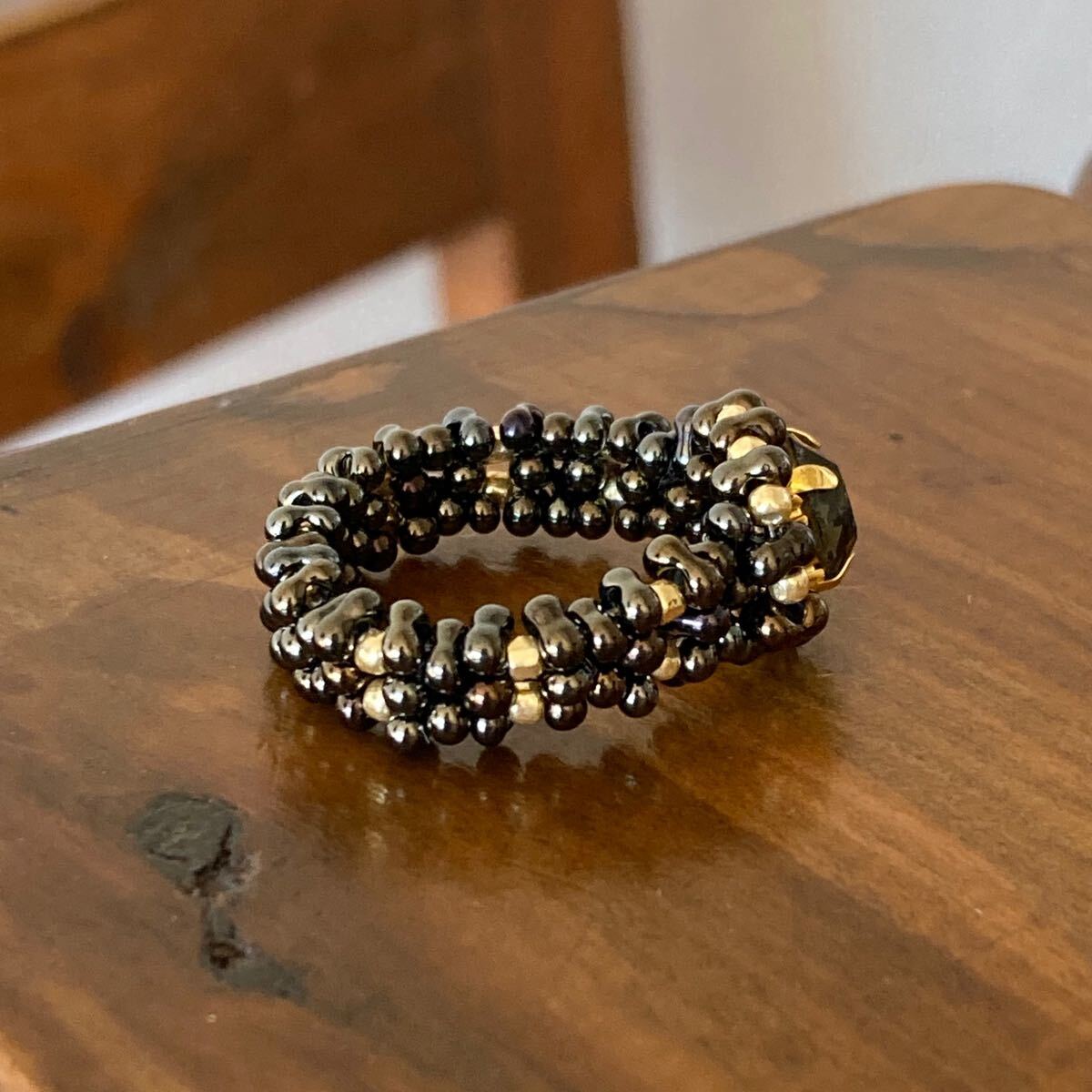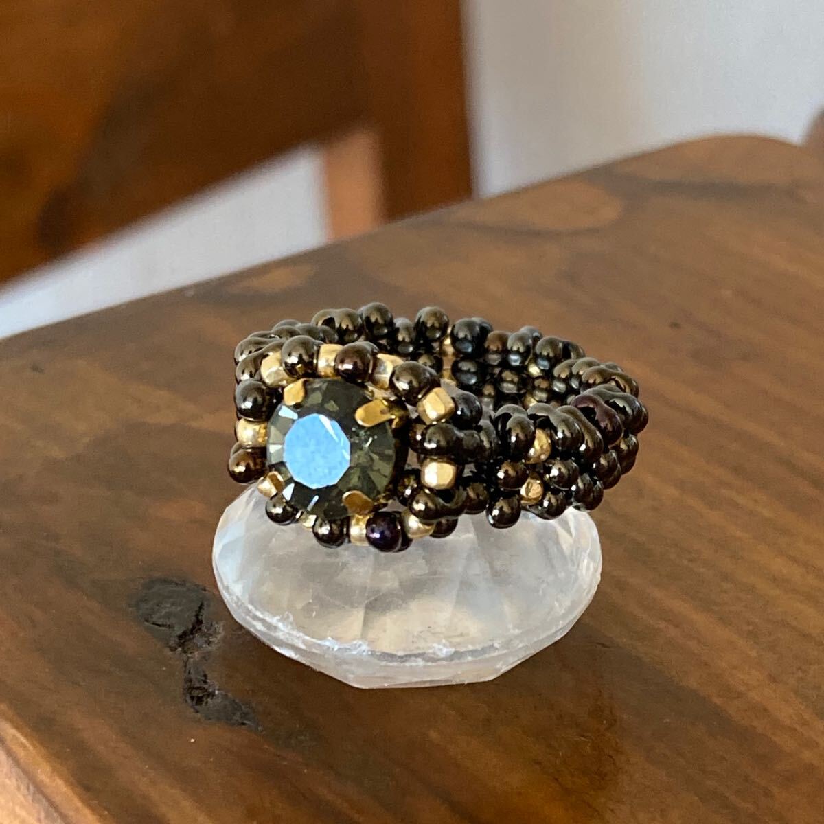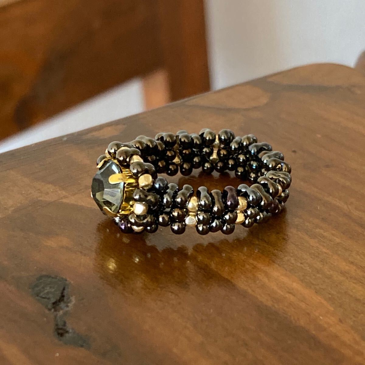8mmのグレーのラインストーン、カーキブロンズ系のファルファーレビーズ、ゴールドのスリーカットビーズで作ったリングです。
