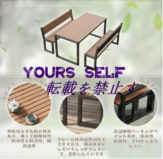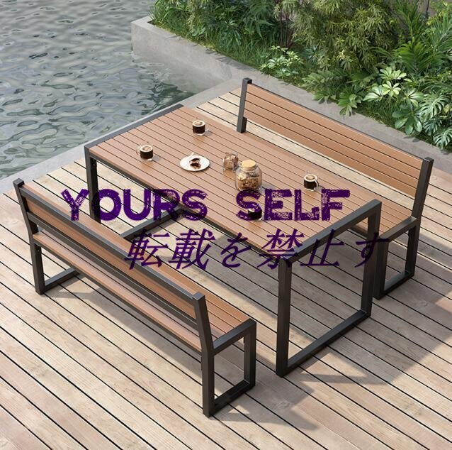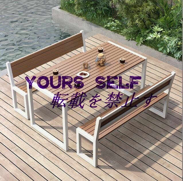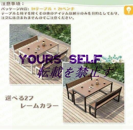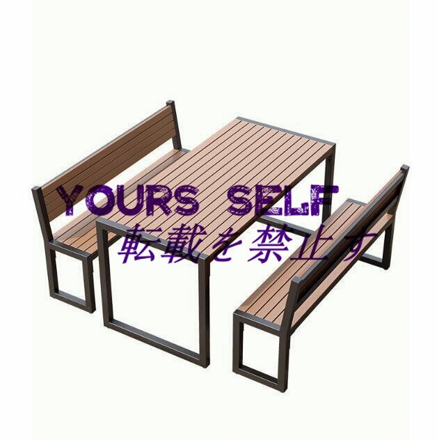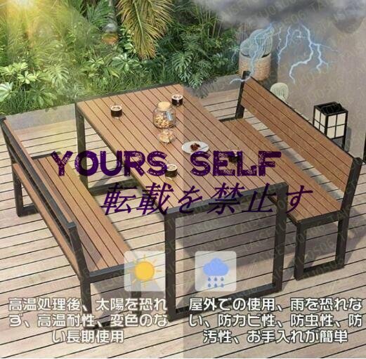 ガーデンテーブル3点セット 屋外ダイニングテーブルとベンチセット 金属フレーム プラスチック製の木製のテーブルトップ 防水性と耐日光性