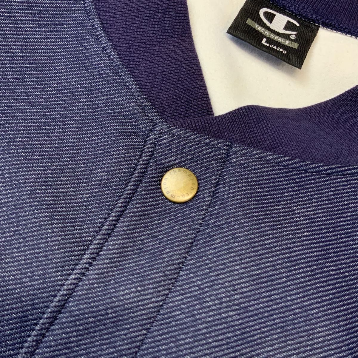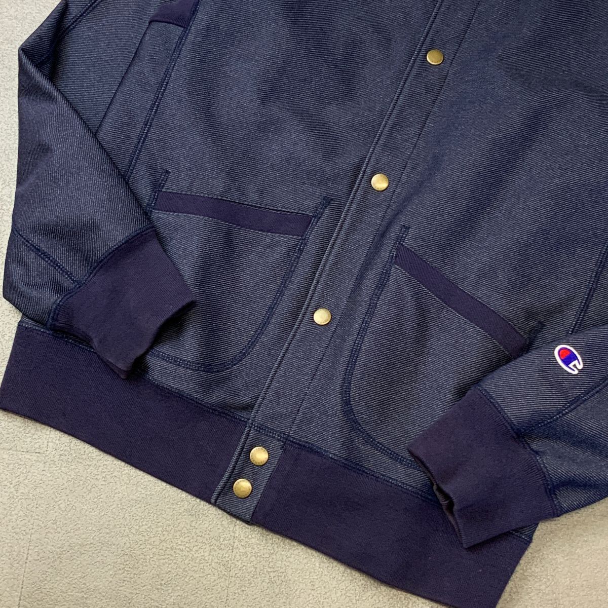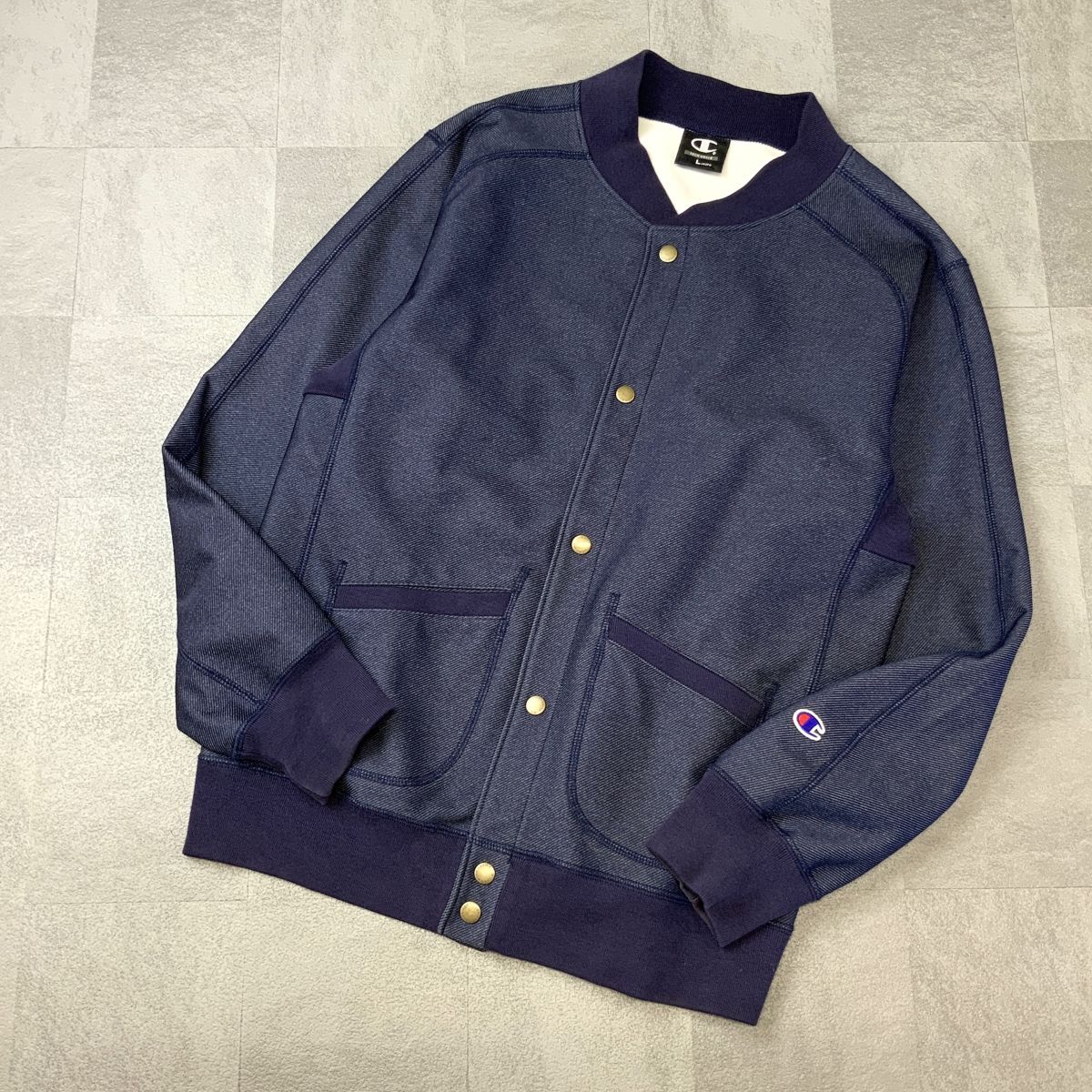 美品 champion チャンピオン MA1 スナップボタン ノーカラー デニム調 ジャケット メンズ Lサイズ ネイビー