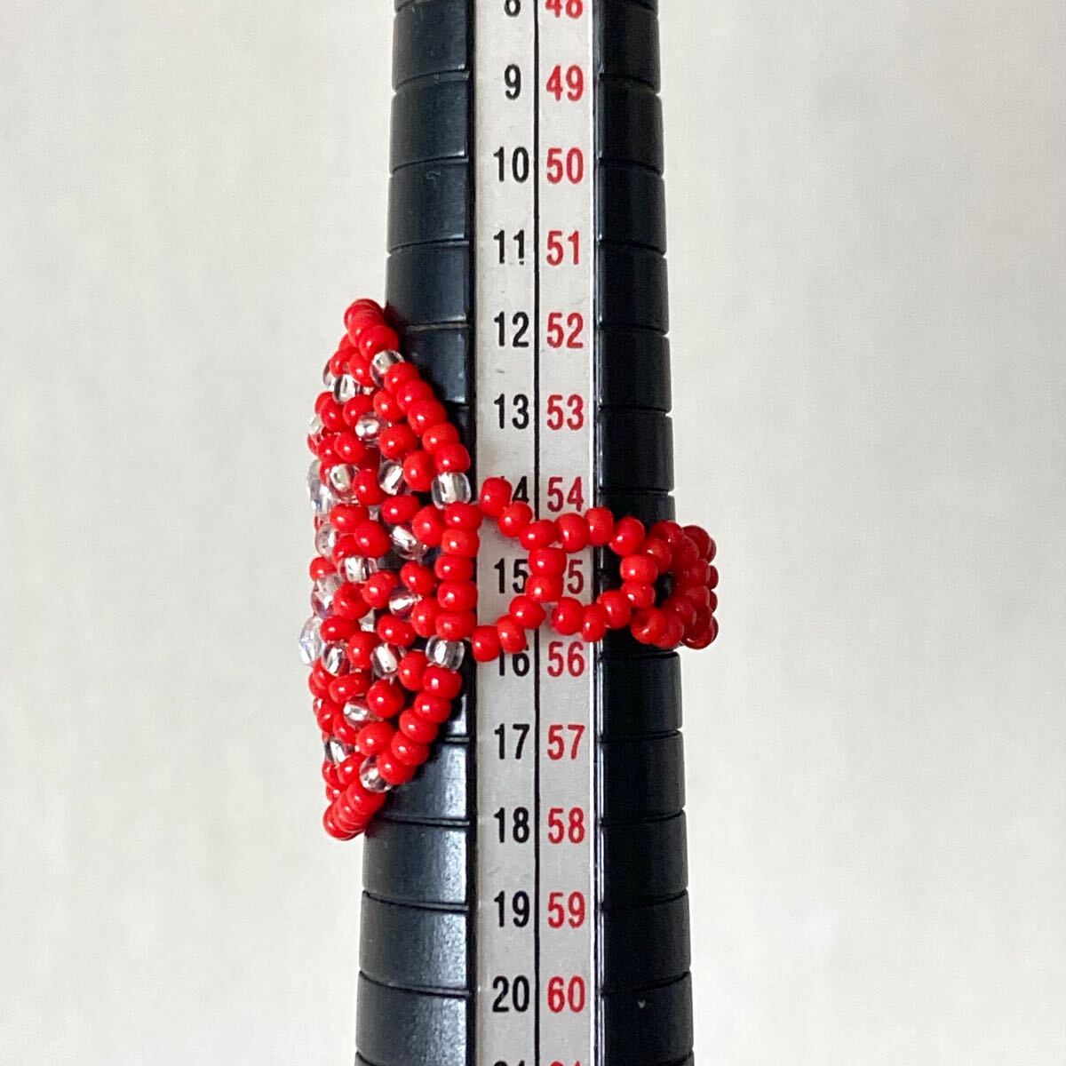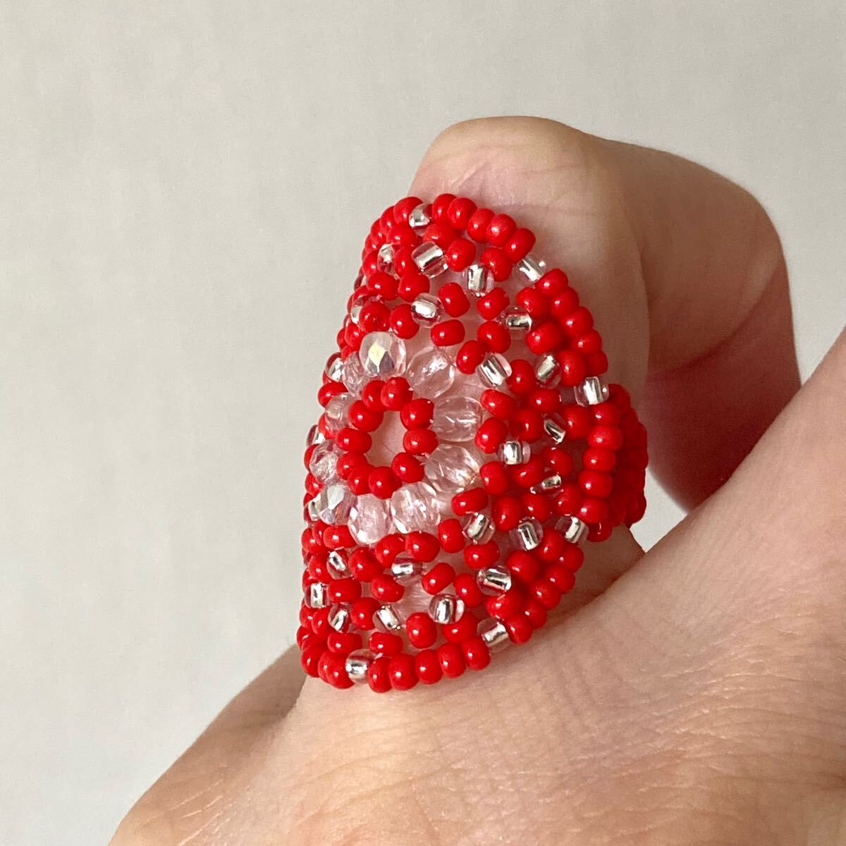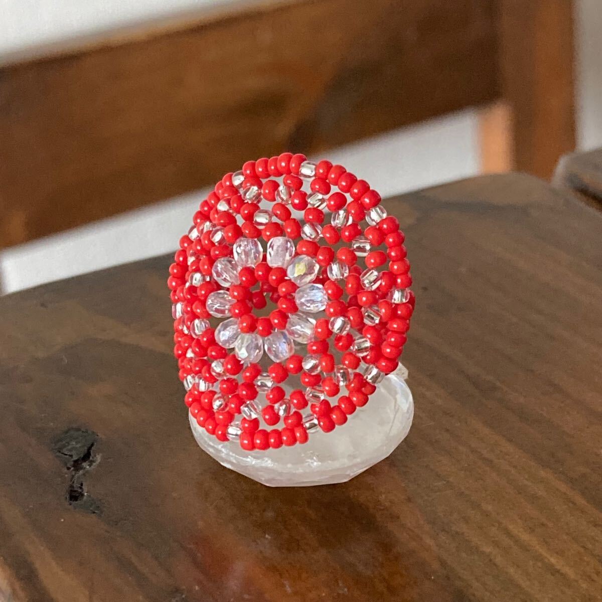 ビーズ リング 指輪 ハンドメイド 大きい丸型 赤×クリア 14-16号です。