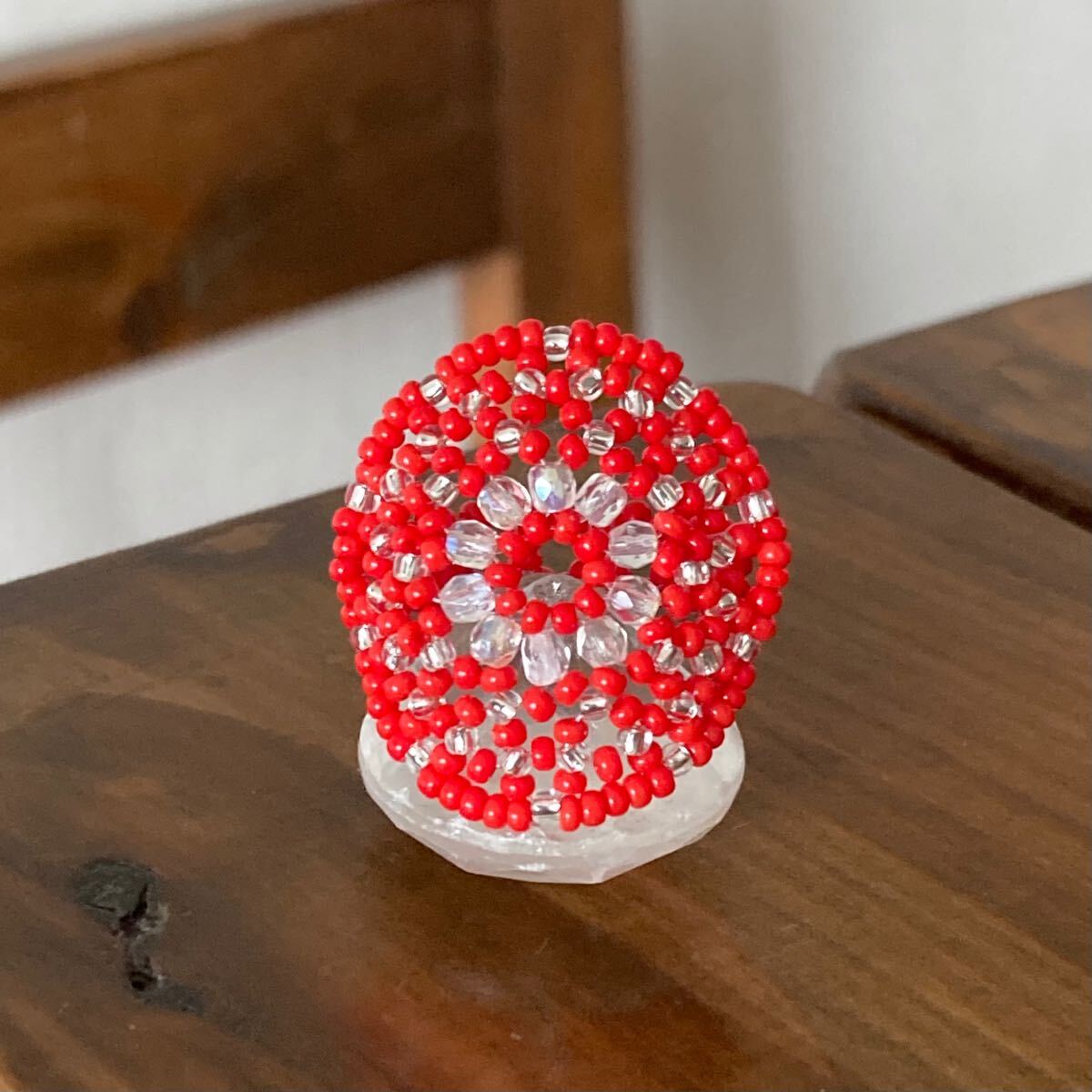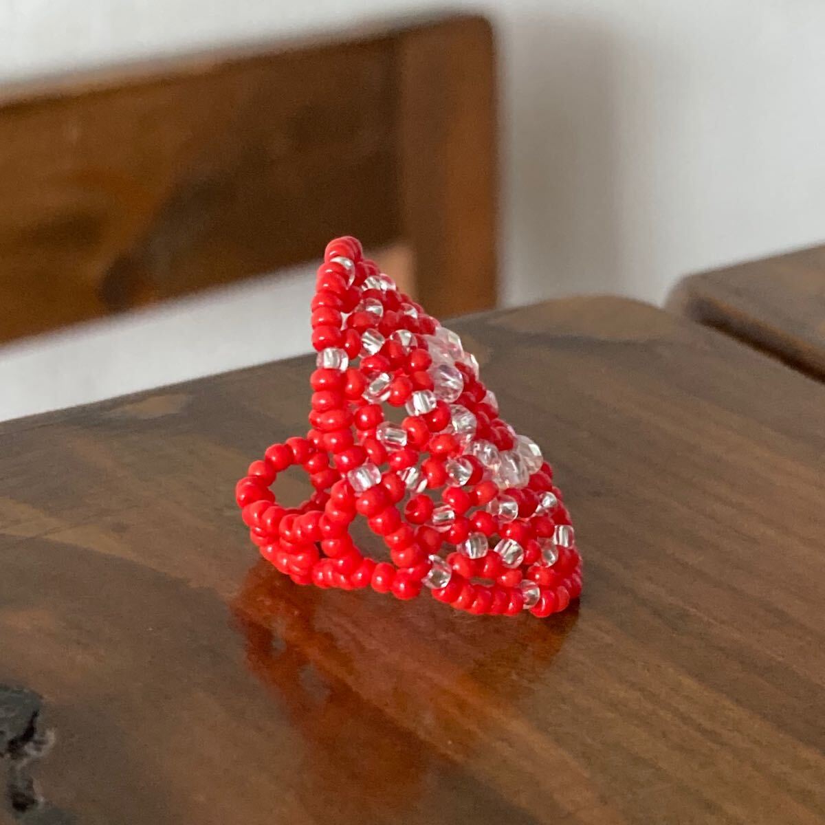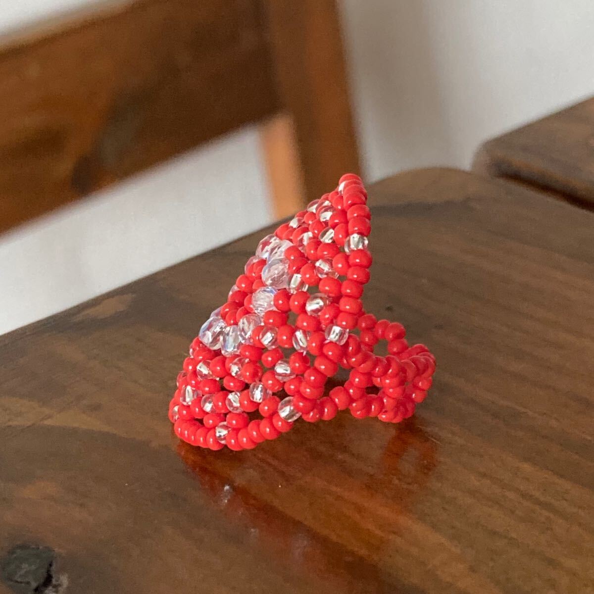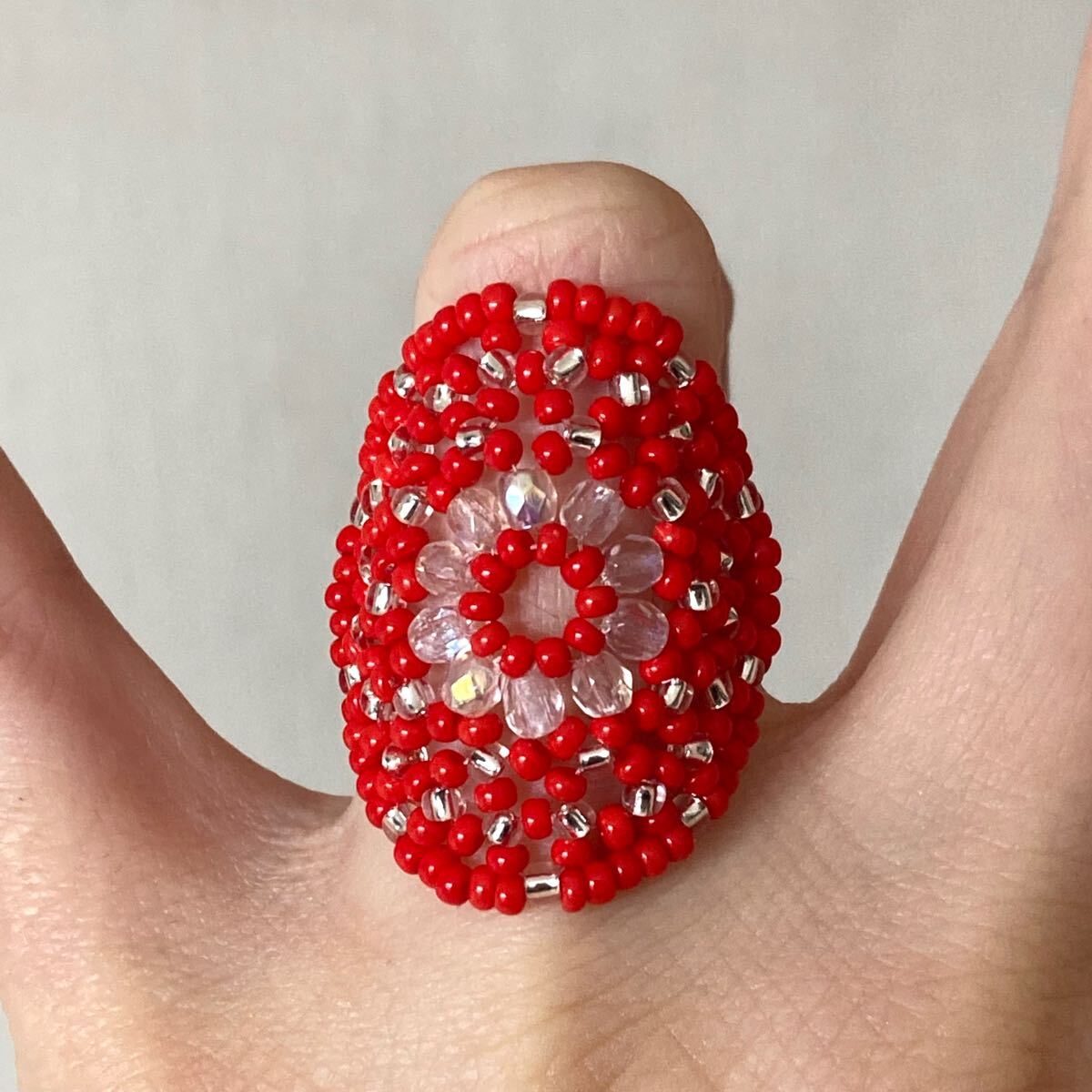 ビーズ リング 指輪 ハンドメイド 大きい丸型 赤×クリア 14-16号です。