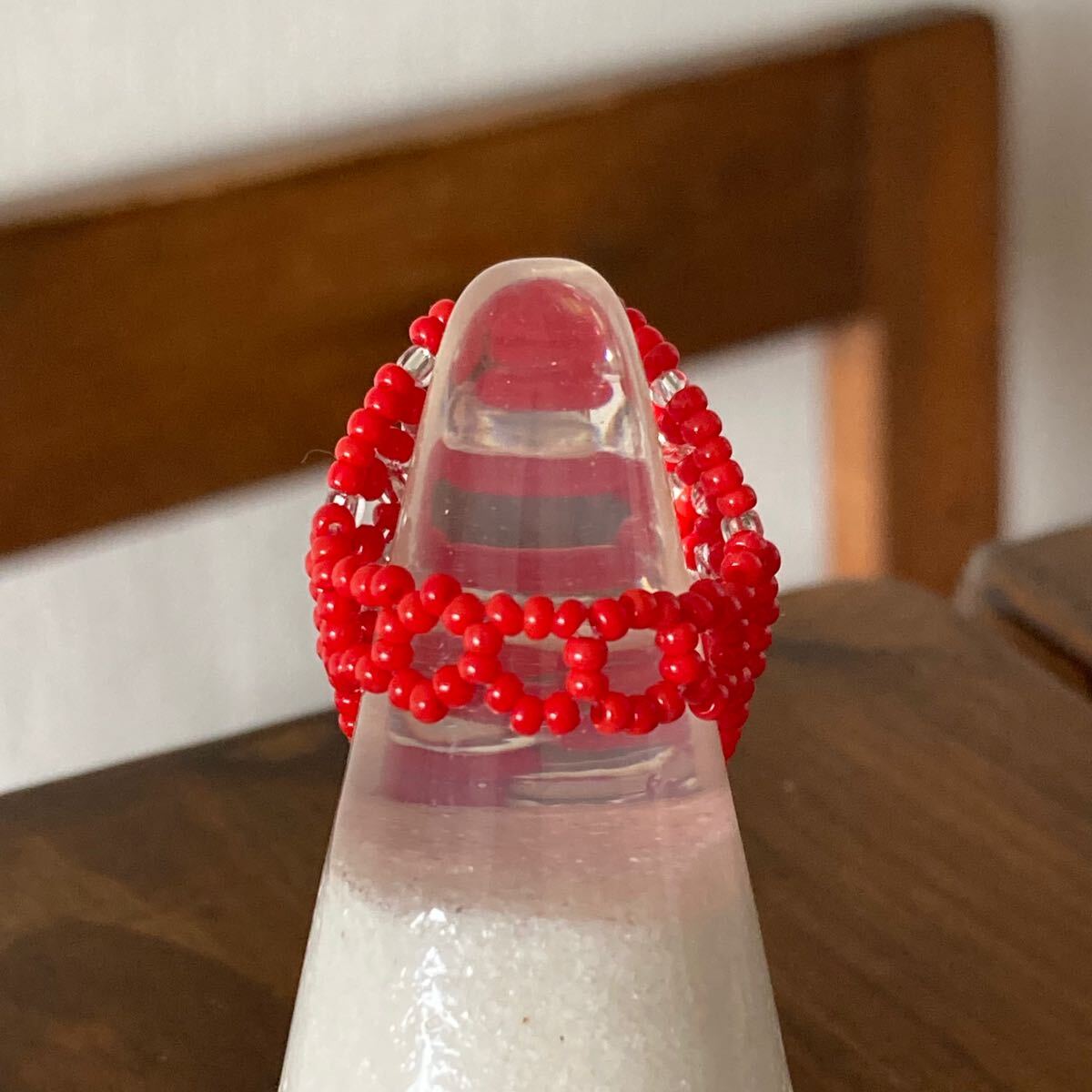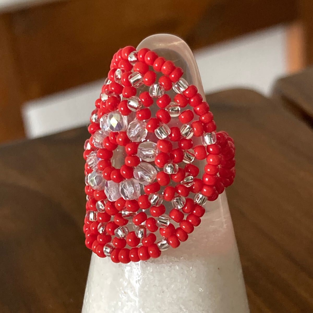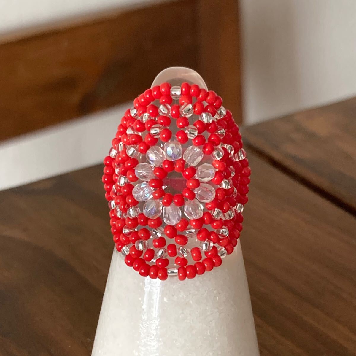 ビーズ リング 指輪 ハンドメイド 大きい丸型 赤×クリア