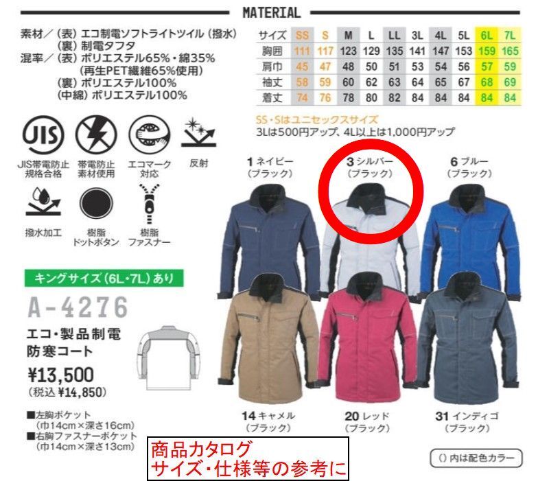メーカー小売り希望価格:14,850円(税込) こちらの商品は、在庫があれば複数枚組が可能です。 1枚につき+1,500円で対応いたします。 ご希望の方は質問欄から、色とサイズをお問い合わせください。 在庫がありましたら、再出品いたします。 1枚組を落札後に、複数枚組への変更は出来ませんのでご注意ください。 メーカー:コーコス 商品コード:A-4276 商品名:防寒コート 季節:冬 使用素材: 表:エコ静電ソフトライトツイル(撥水) 裏:静電タフタ 混率: 表:ポリエステル65%・綿35% 裏:ポリエステル100% 中綿:ポリエステル100% 備考:色・サイズは出品タイトルで必ずご確認ください。 上記以外の詳細事項に関しては、 メーカーへ問い合わせるか、実店舗でご確認ください 商品の詳細に関してタグ記載事項のみ記載させて頂いております。 股上、裾わたり、裾幅等の質問にはお答え出来ません |