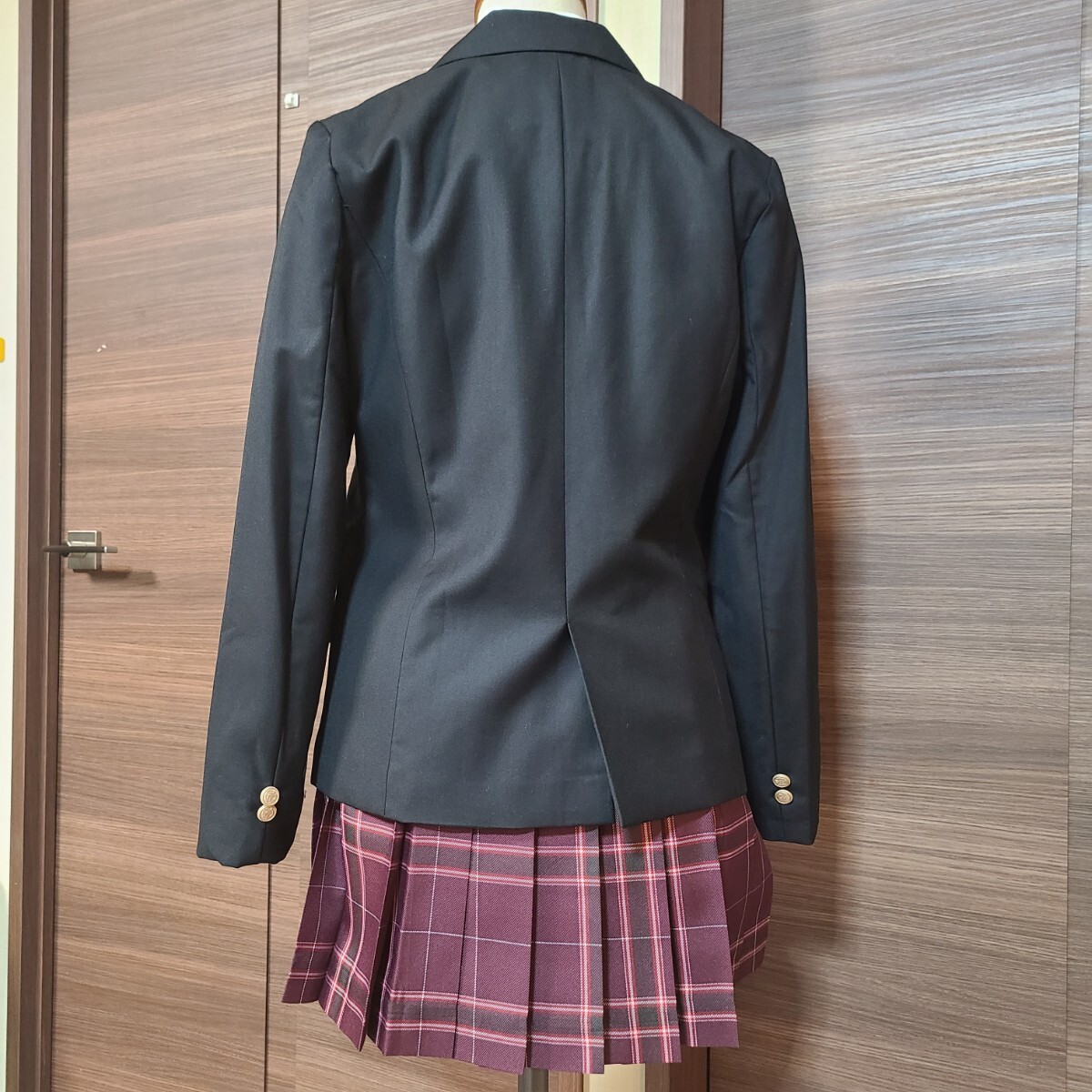 裏地付きのしっかりとしたブラックのブレザーに人気の高い赤チェックスカート