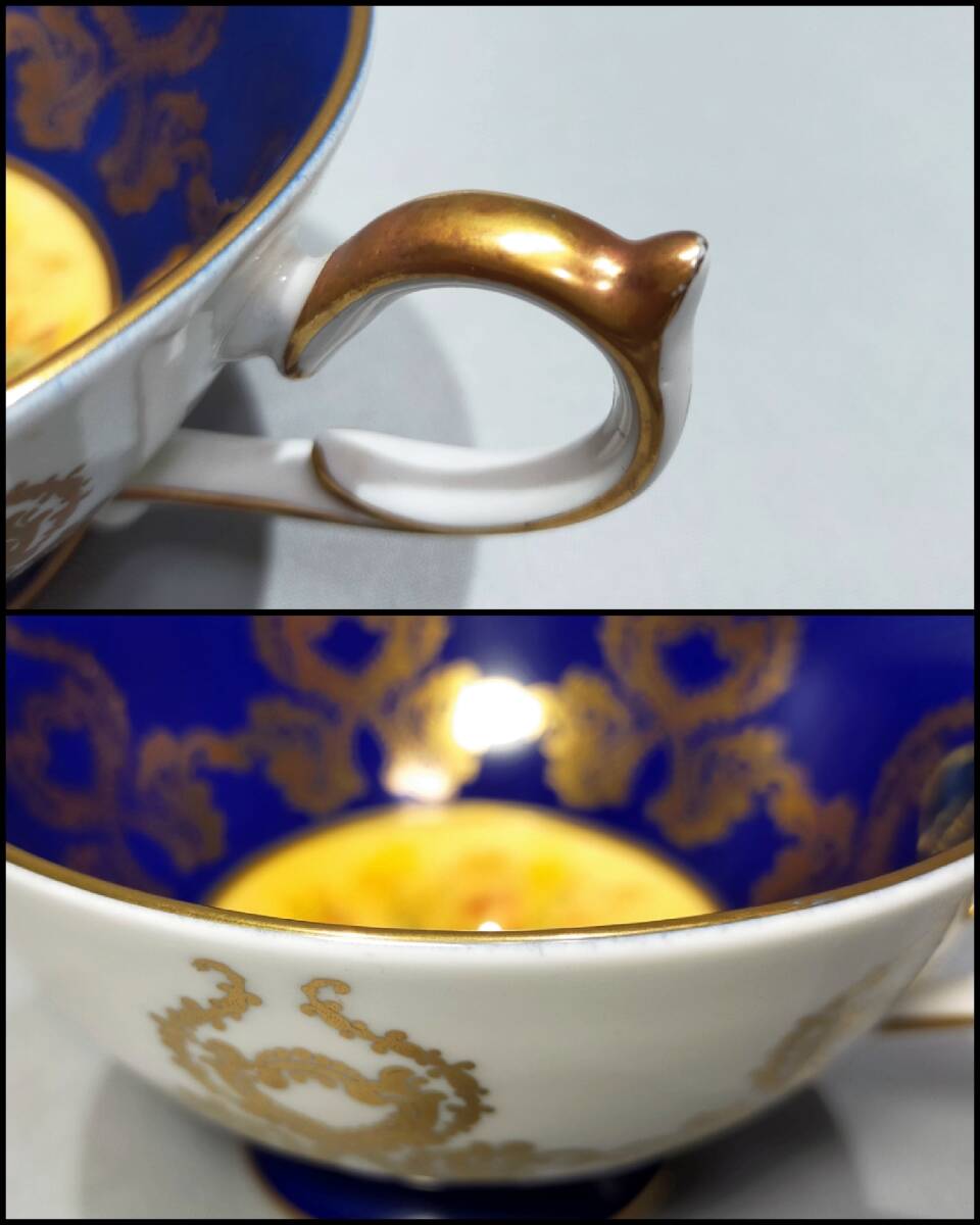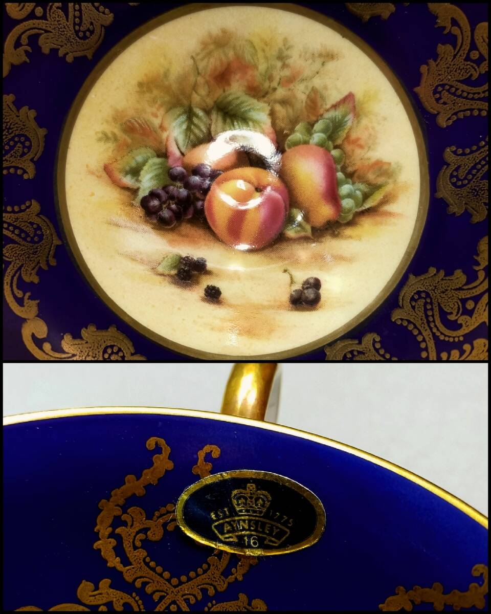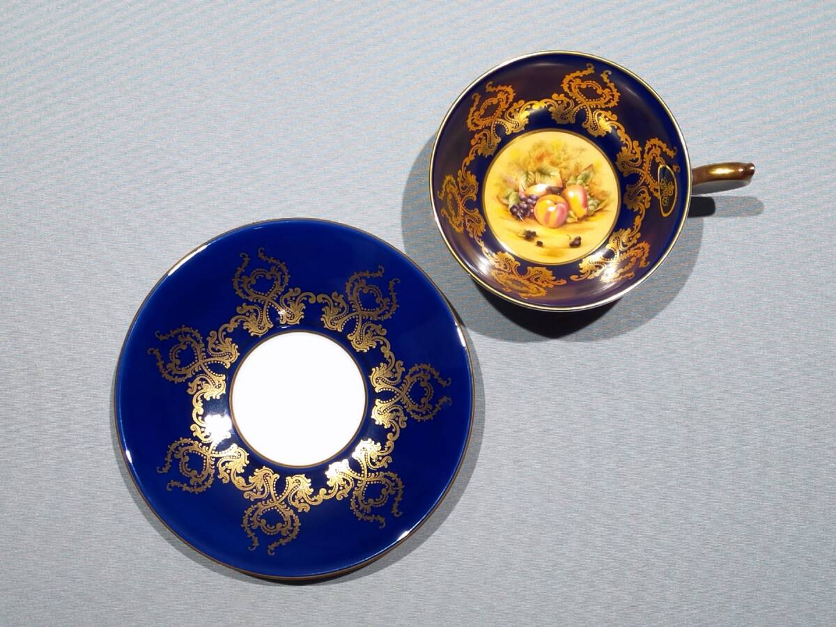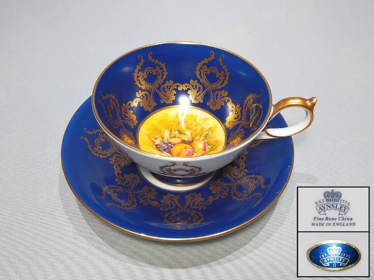 美品 ティー カップ&ソーサー AYNSLEY エインズレイ オーチャードゴールド 金彩 フルーツ コバルトブルー