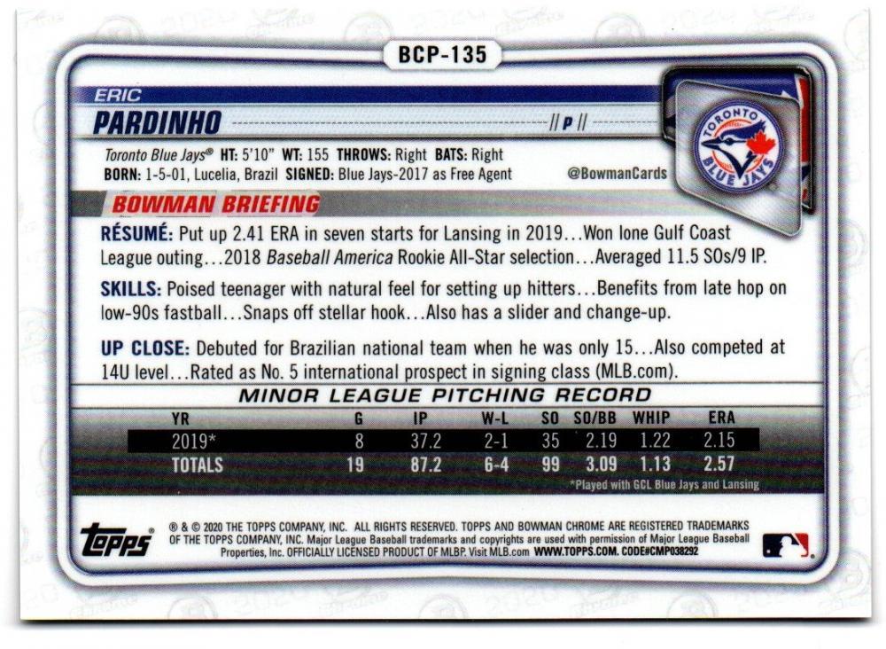 【ERIC PARDINHO(Toronto Blue Jays)】2020 BOWMAN Chrome Prospects Gold Refractors #BCP135[07/50]