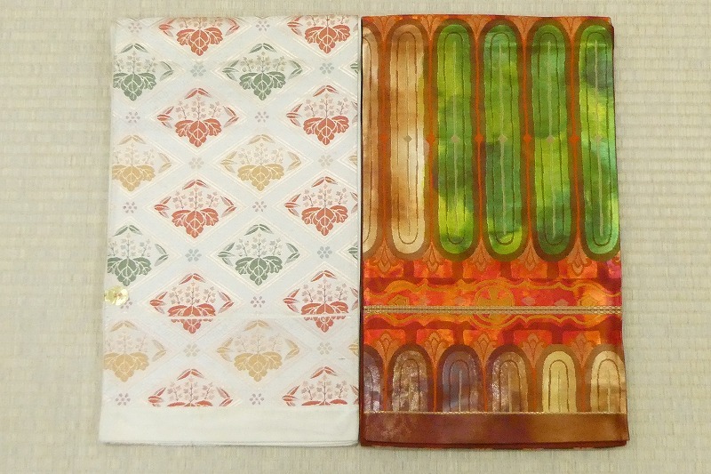 ◆袋帯/2点/西陣織/花柄等/リメイク・材料等に/新品/未仕立て/正絹/(梱包サイズ:80)◆* コメント・全体的に薄汚れ・薄い色ヤケがあります。 ・新品ですが、経年保存されていたお品ですので、ご理解のある方のご入札をお願い致します。 ・シミ、ヤケ等の難がある為、リメイク・材料・素材用としてのご利用をお薦めします。 ・ ・ * 品質・サイズ -- 着物サイズ目安 -- ・証紙番号:308、1002 ・ ・ ・※一部商品のみのお取引はお断り致しております。入札前・落札後に一部の商品のみのお取引交渉や発送方法(メール便等利用)の交渉はご遠慮下さい。サイズ・発送詳細を必ずご確認のうえ、ご理解・ご納得のうえでのご入札をお願い致します。 ・梱包サイズ:80サイズ(発送詳細必読) * 程度 当社基準ランク・・・【4~5】