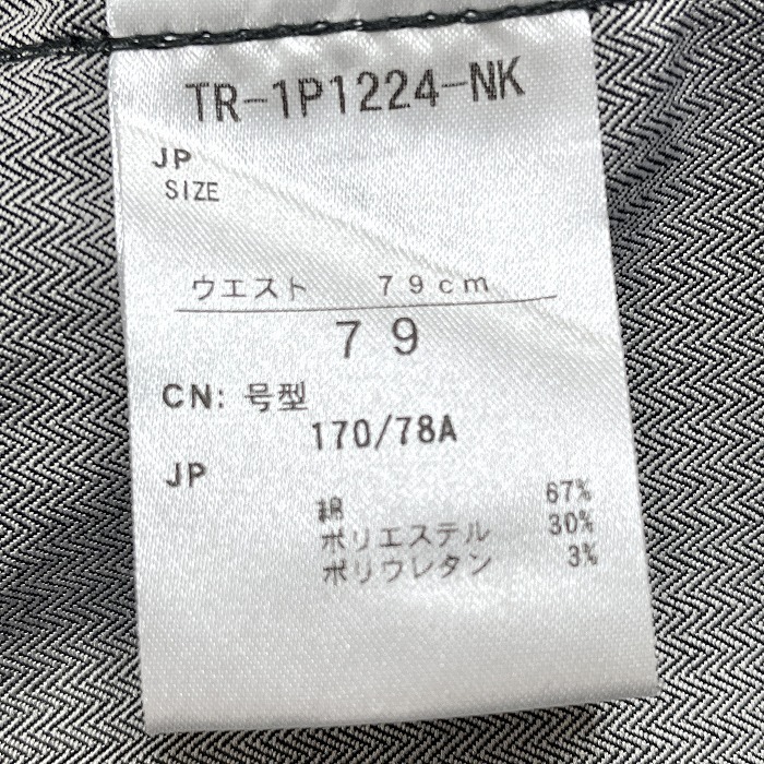 | 実寸サイズ | (タグ表記:79) ・裾幅19cm ・ウエスト79cm ・股上24cm ・股下75cm ・ヒップ104cm ・わたり幅28cm |