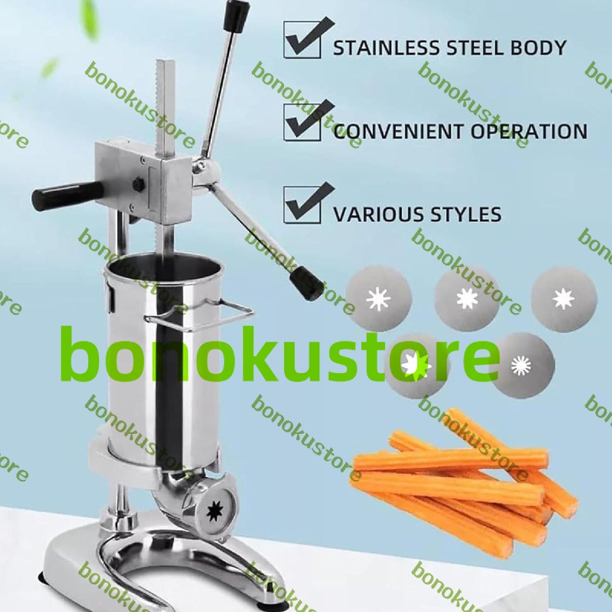 このステンレス製のチュロスメーカーは、キッチンでの忙しい日々にも耐えられるよう作られています。仕様:名前: ラテンフルーツジャムフィラー材質: ステンレススチールサイズ: 190*230*700mm容量: 2L/3Lパッケージ内容業務用手動チュロスメーカー 1 台注意:照明やディスプレイの都合上、実際の商品と写真には色の違いがありますので、実際の商品を参照してください上記のデータは参考用です。サイズは手動で測定しているため、1~3cm の誤差が生じる場合がありますので、実際の商品を参照してください。ありがとうございます。