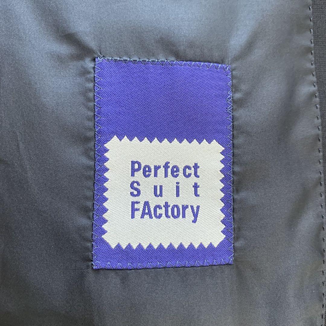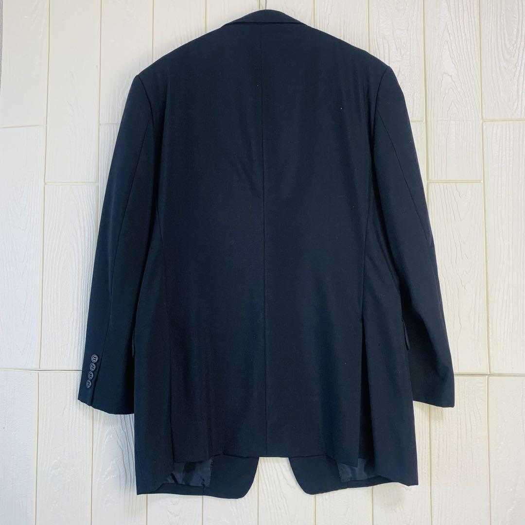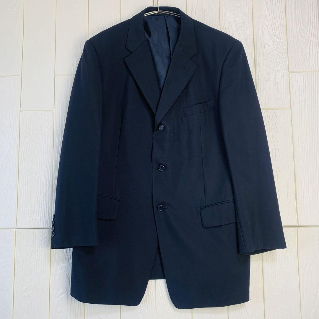 ダークグレーのスーツジャケット、3つボタン、胸ポケット付き。