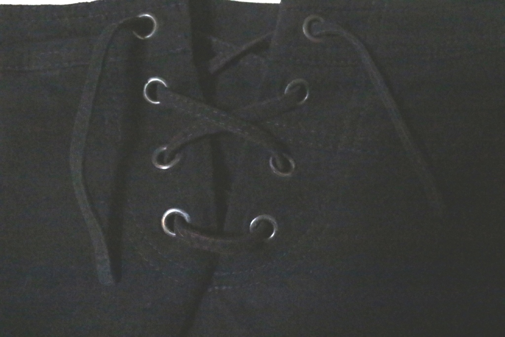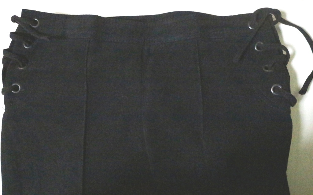 ピーチスキン加工された綿とポリウレタンの混紡地で伸縮性があり、またサイドにシューレース(編み上げ)を使ったデザイン性の高いパンツでウエストも紐で調節できます。