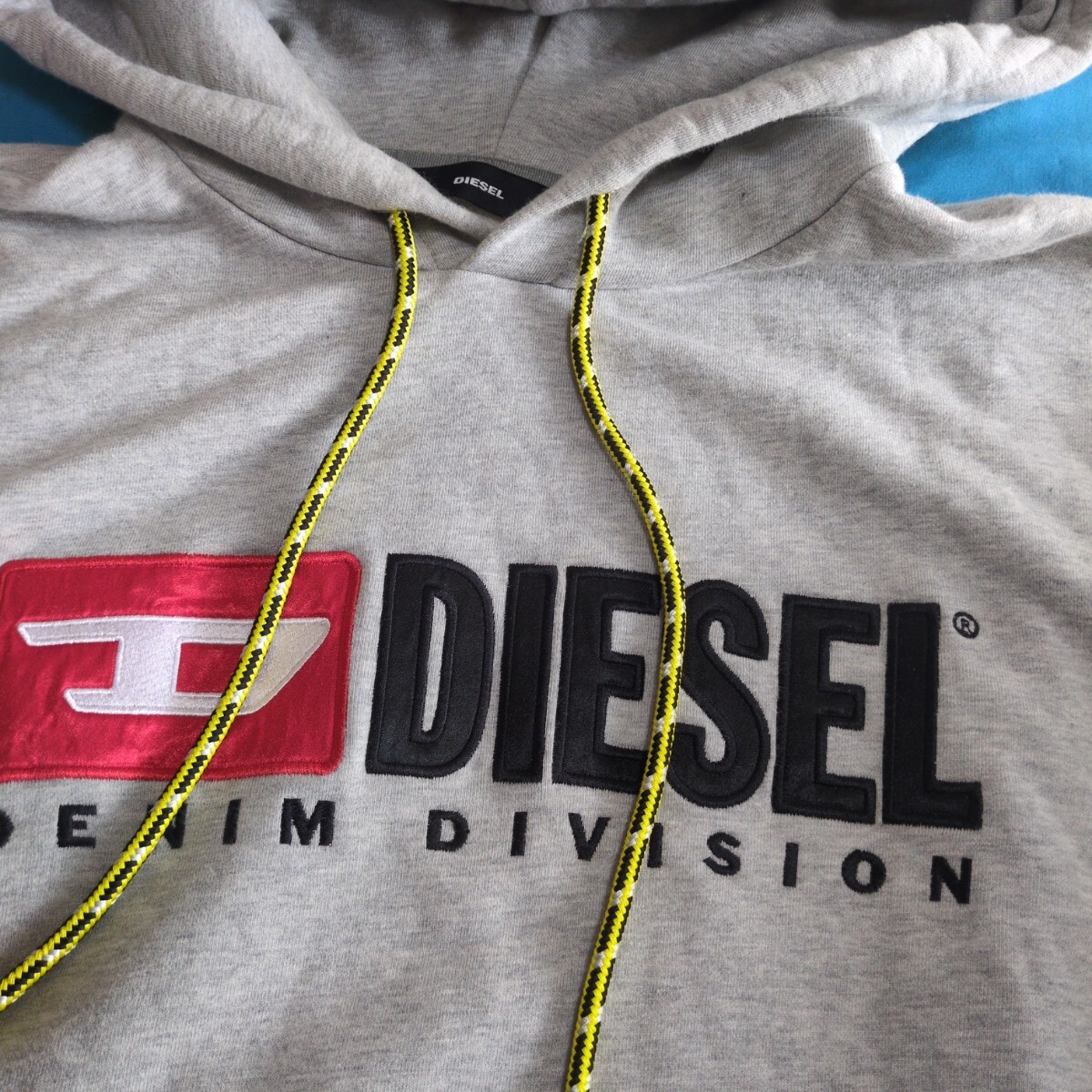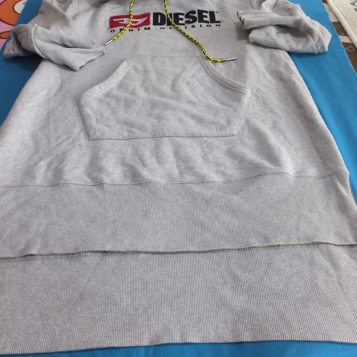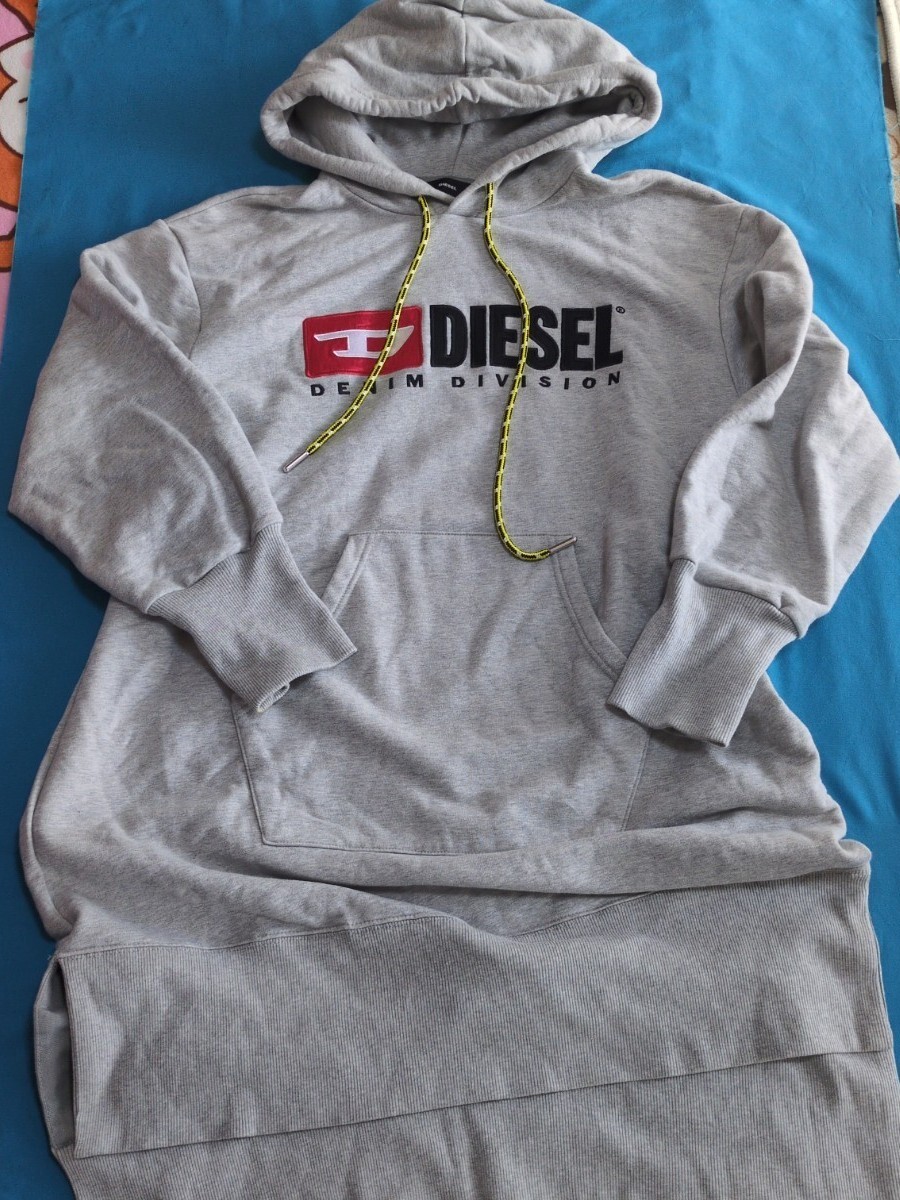 フード付きのグレーのDIESELロゴ入りワンピース。