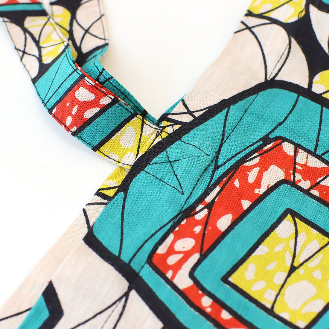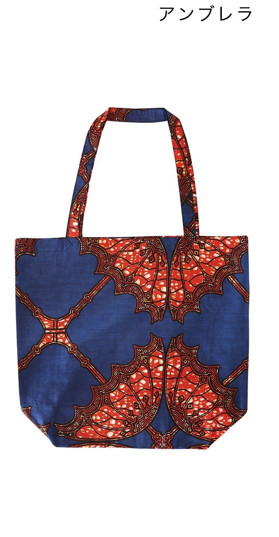 たっぷり入ってコンパクトにまとまるエコバッグ大注目のアフリカンプリントは大胆な色使いのパターンでファッションのアクセントにおすすめですプリントに若干の染め斑などがございます。ご了承の上でお買い上げください。サイズ・容量:約39×30×14cm素材:綿100% インド製
