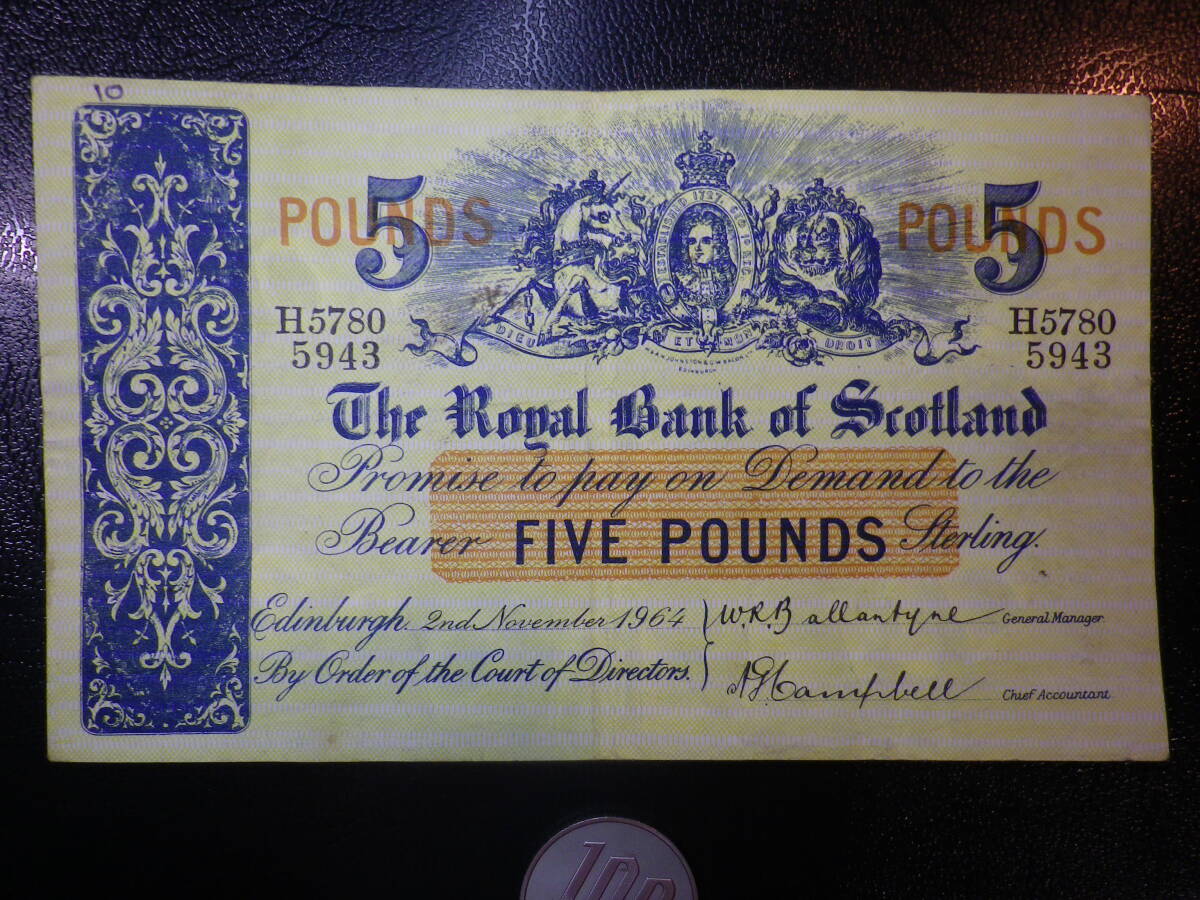 ローヤルスコット銀行 1964年 5Pounds 並品+~美品 (片面印刷)