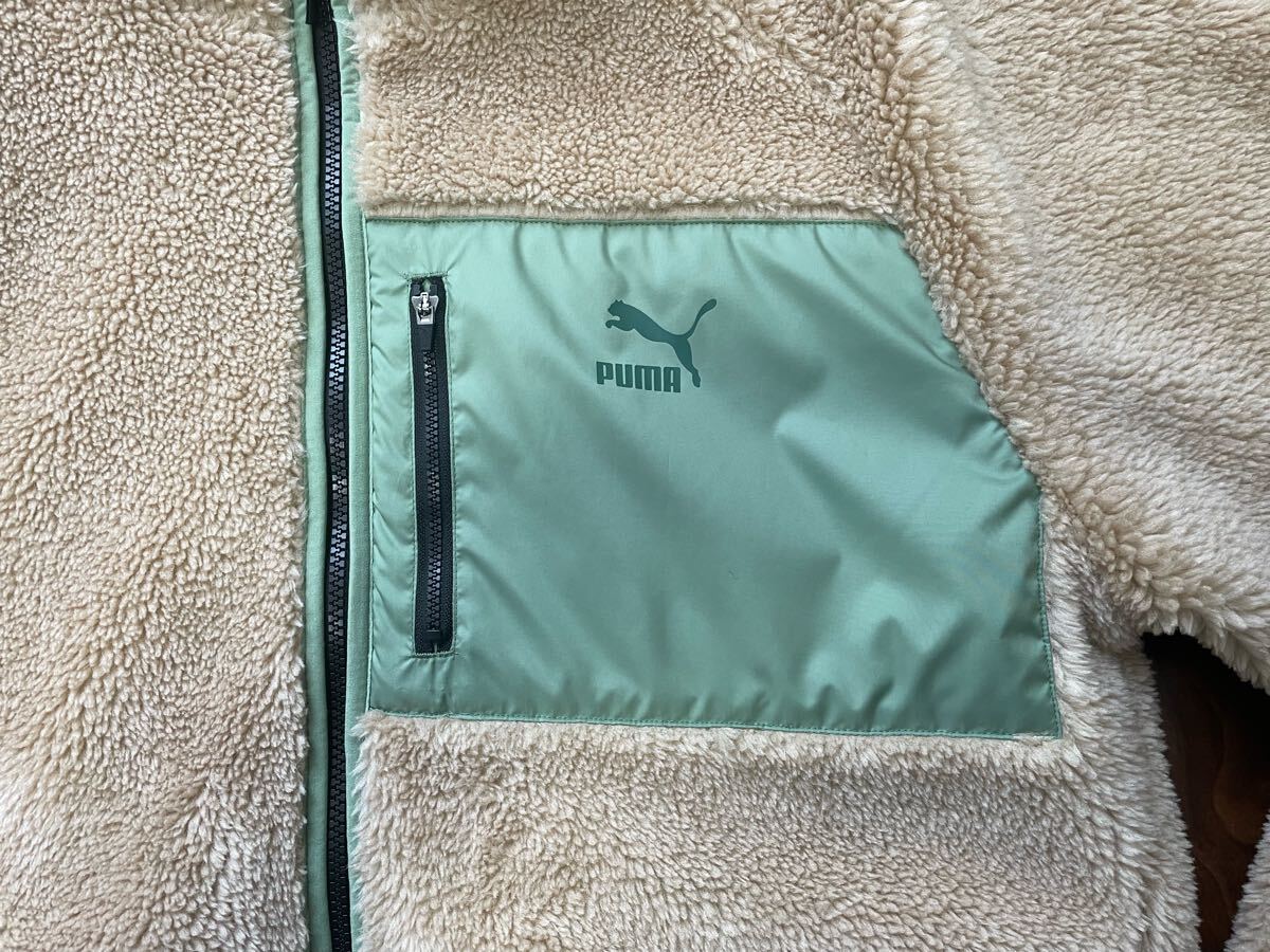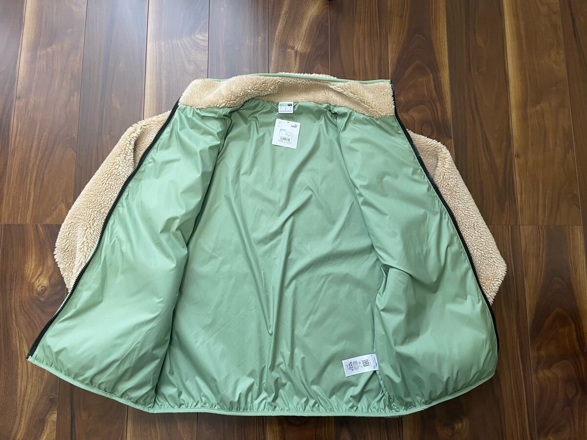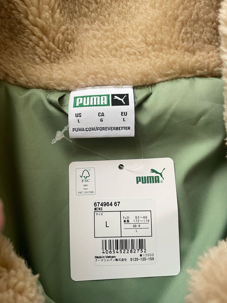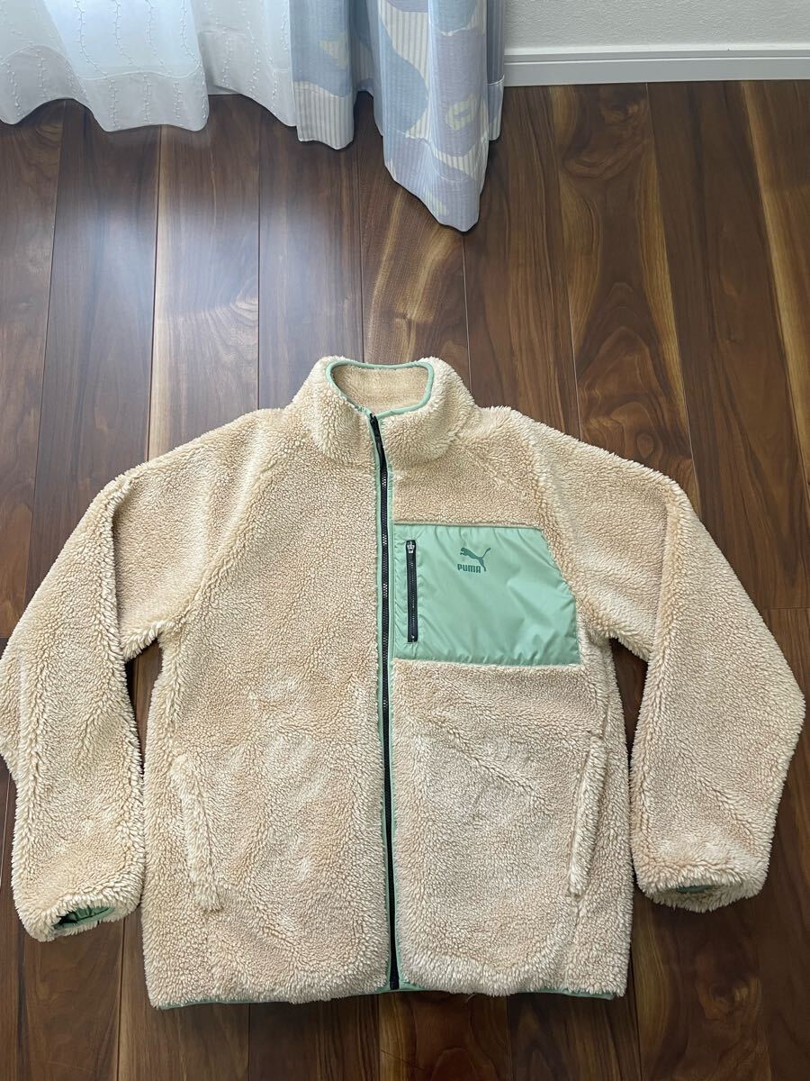 PUMAのLサイズ、ベージュのフリースジャケット。ジッパーポケット付きで、カジュアルなスタイルに最適。