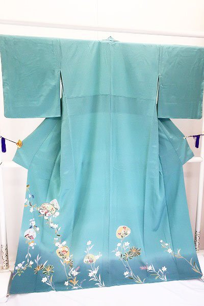 【送料無料】未使用品 訪問着 淡い青緑 枝花 手描き友禅 京友禅 トールサイズ 身丈166.5cm フォーマル 着物 仕立て上がり 正絹 m-7367 |
