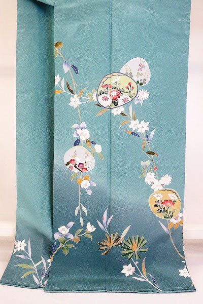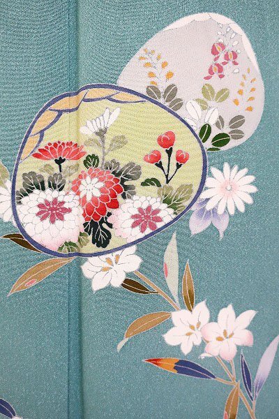 〔着物の色〕 淡い青緑 〔八掛の色〕 共生地 〔着物の素材〕 正絹 |