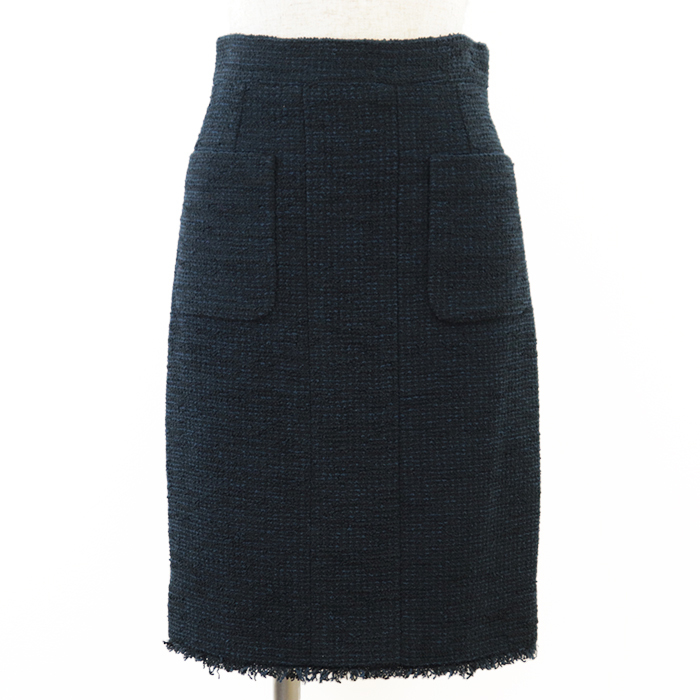 【極美品】CHANEL シャネル スカート 13年 P45116 コットン混 ツイード フロントポケット フリンジ CCボタン ひざ丈 レディース 38 紺 黒