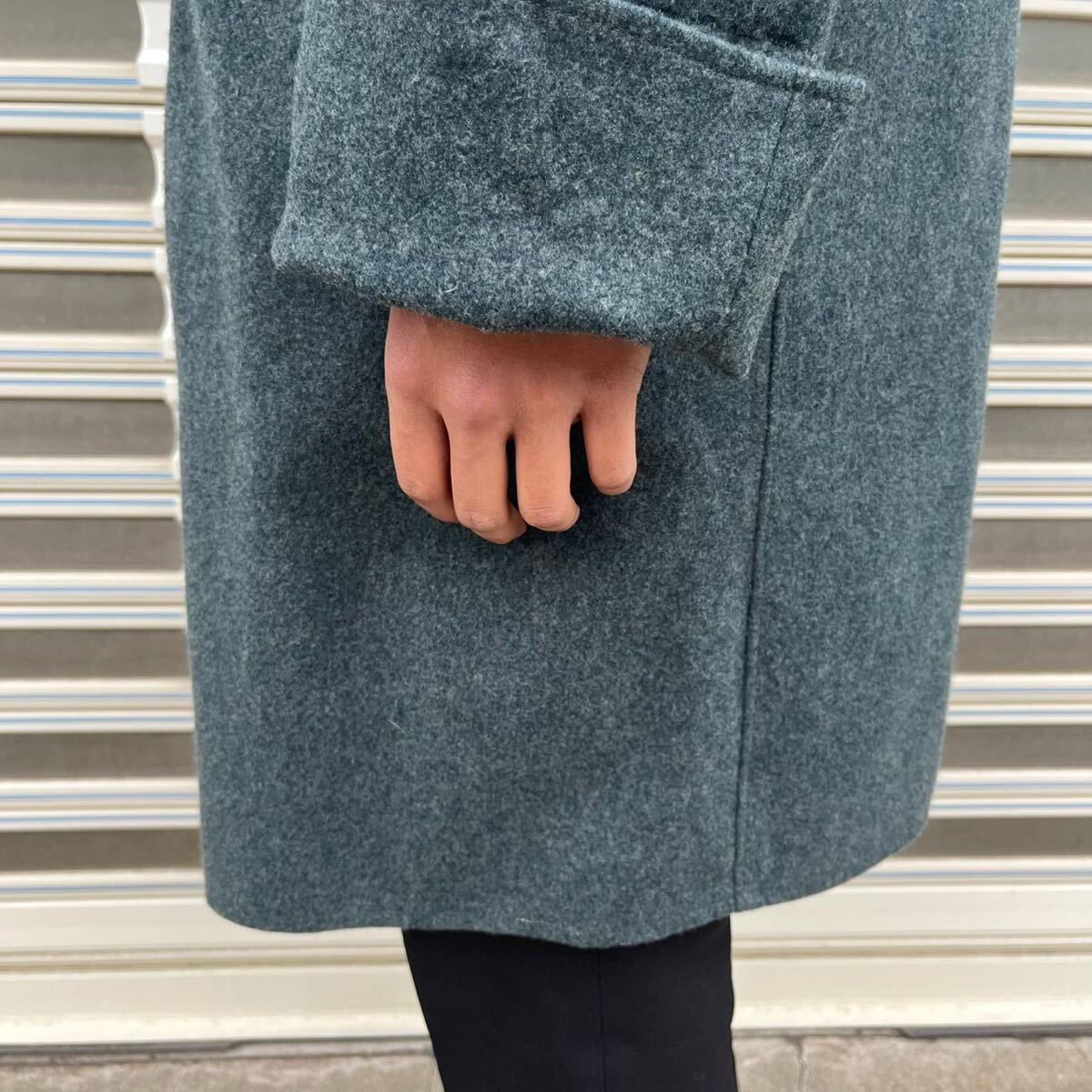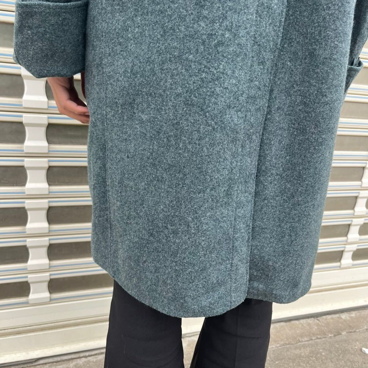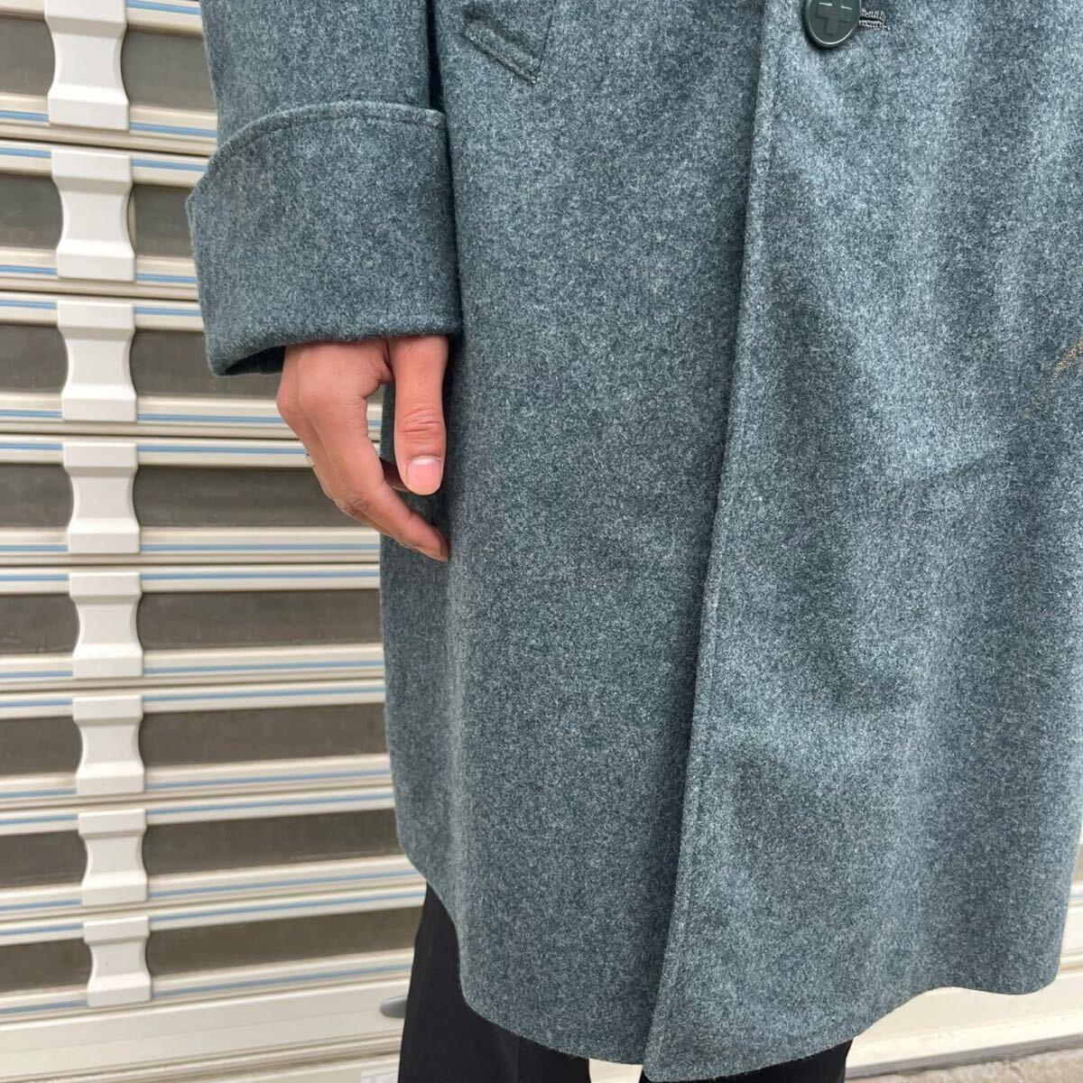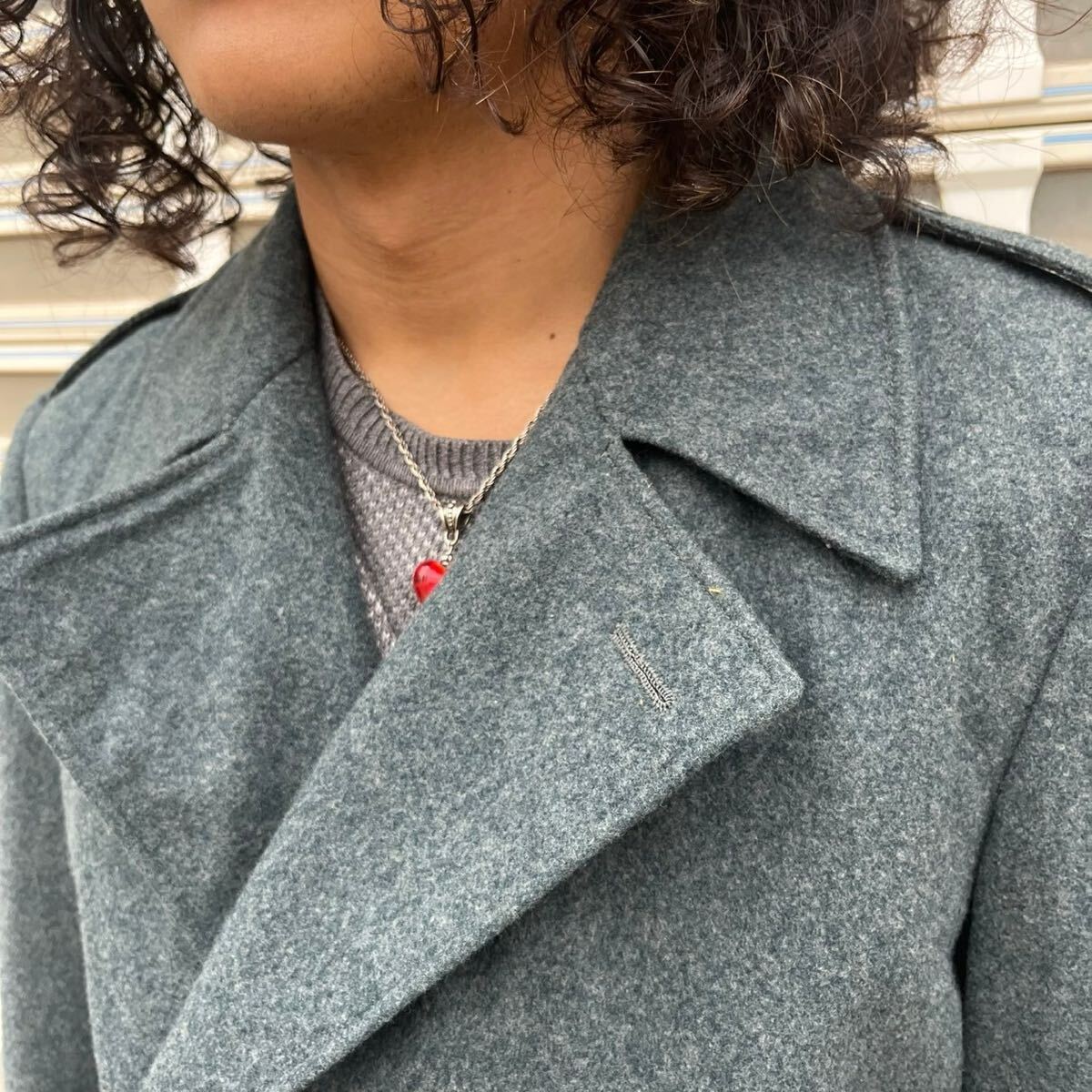 前身頃の重なる部分が深く、2列にボタンが配置されたダブルブレストで、前を開けても閉めても雰囲気よく着こなせる1枚です。